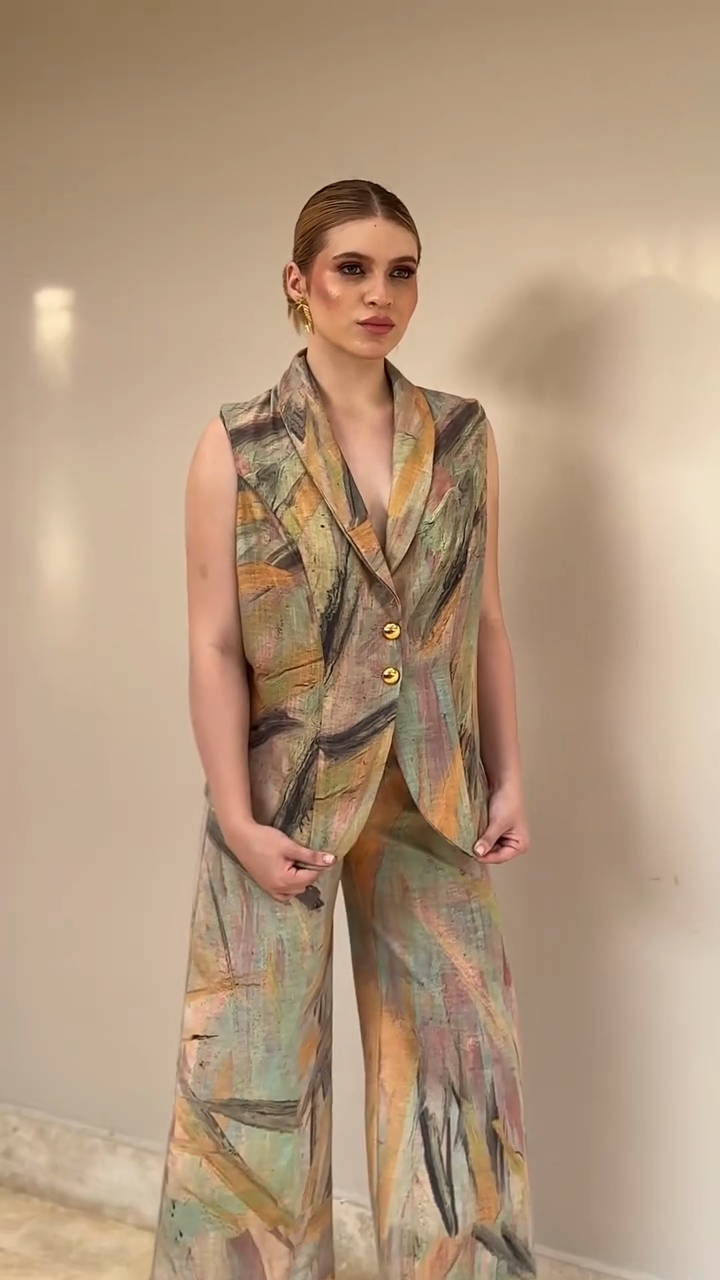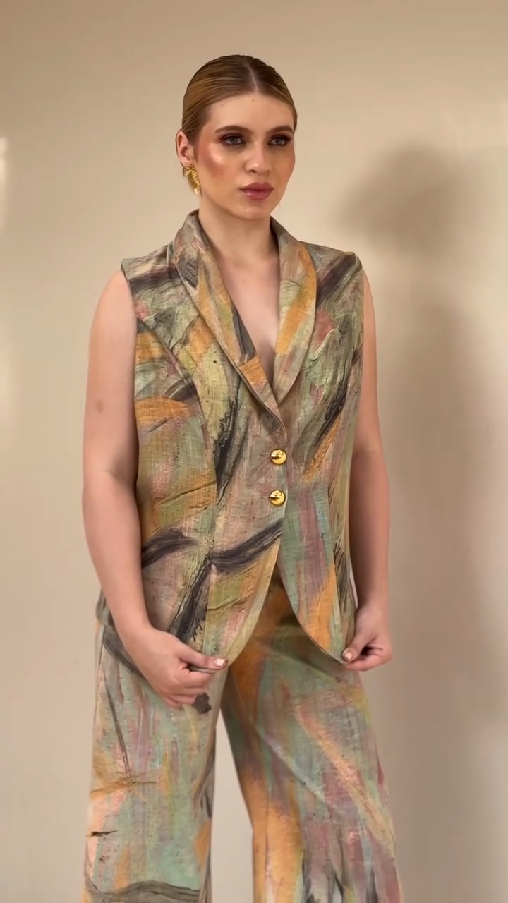 Make a bold fashion statement with this Abstract Print Sleeveless Blazer & Wide - Leg Pants Set. The artistic print and tailored design create a unique, modern look. Perfect for creative events or stylish office days. Lightweight fabric ensures fast page load. Shop now for a standout, chic outfit!