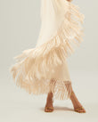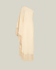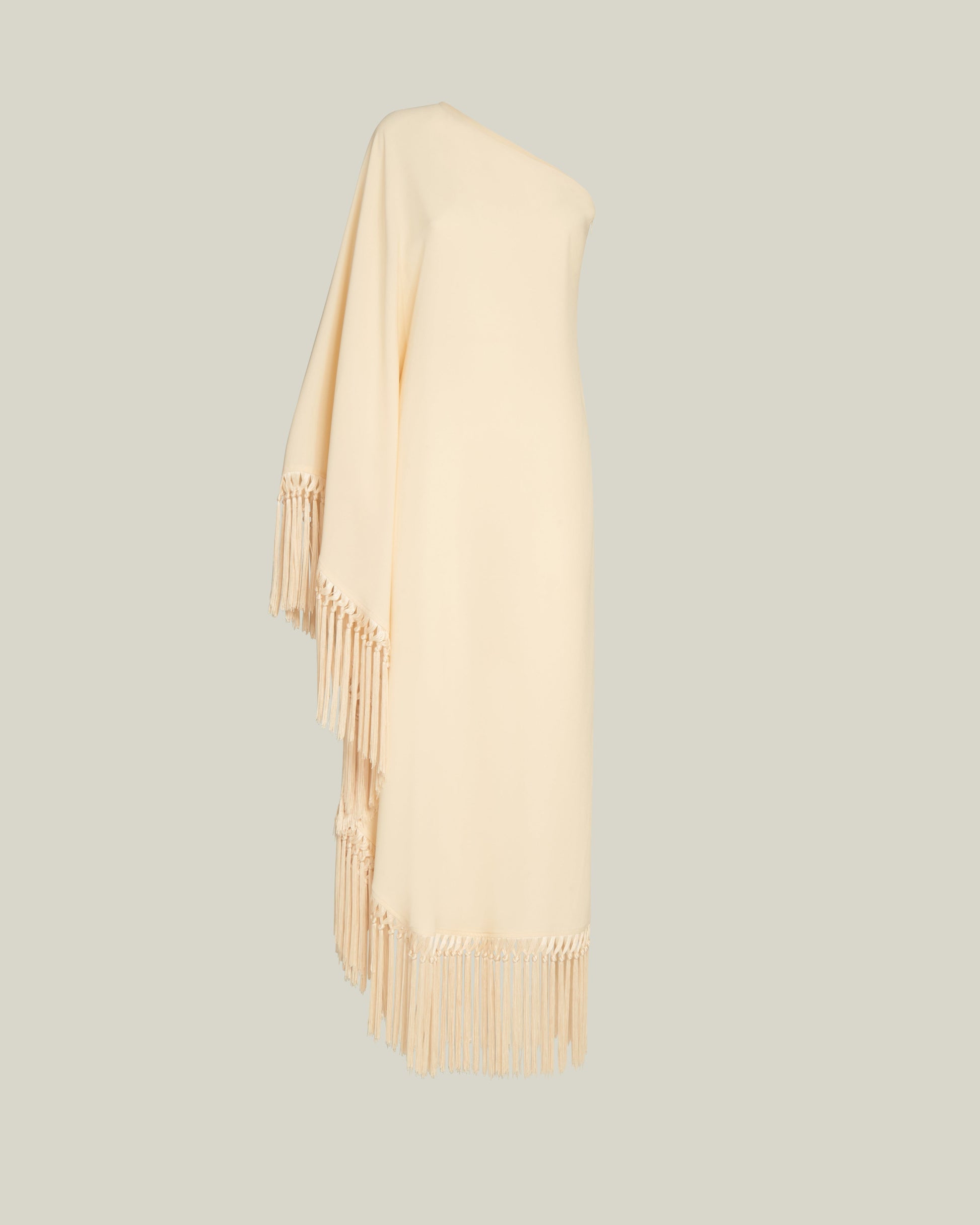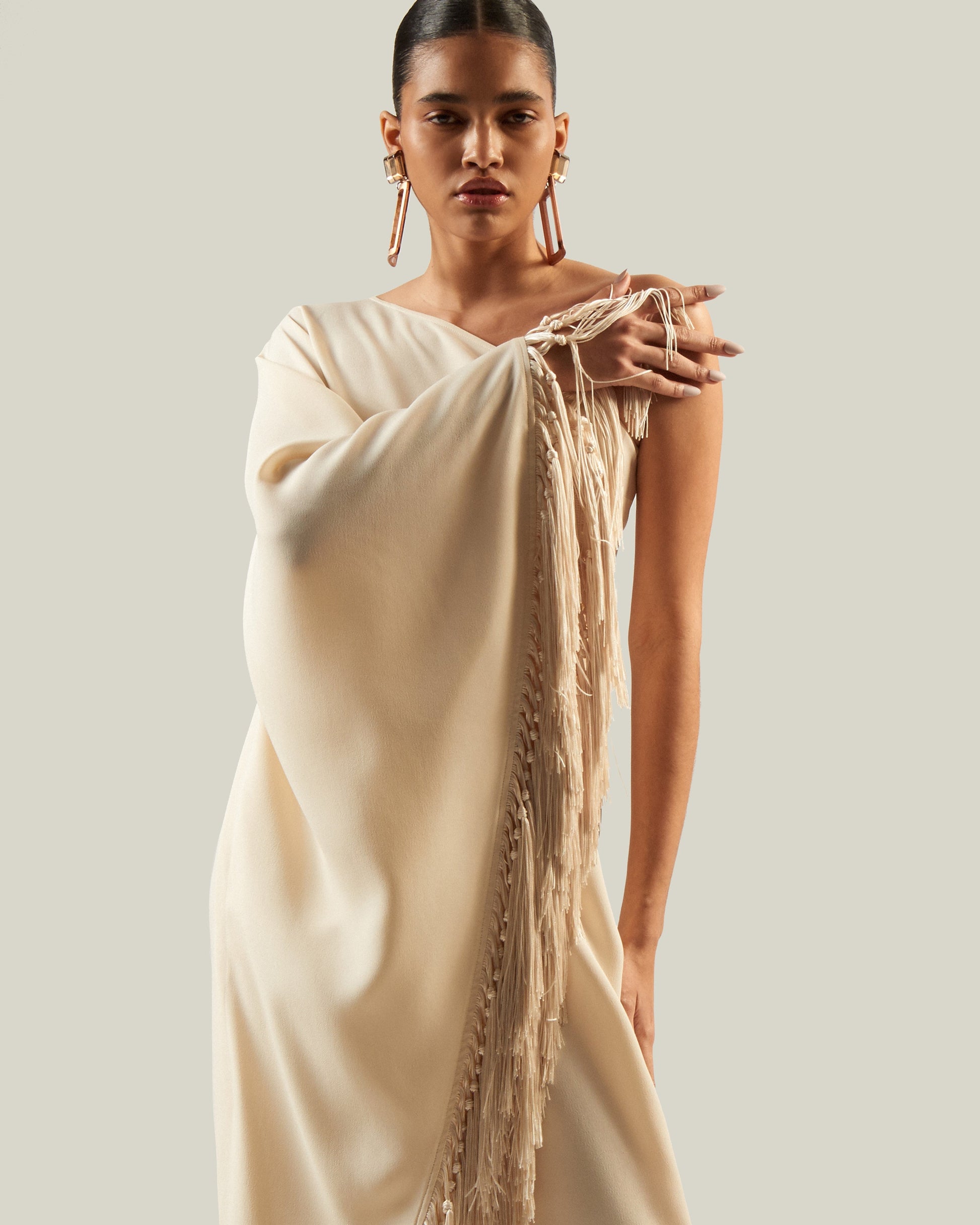 This is a fabulous one-shoulder dress made from viscose-blend crepe cady. The long sleeve and hem are fully trimmed with four meters of playful and fresh hand-tied tonal fringes.