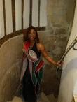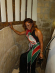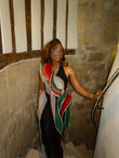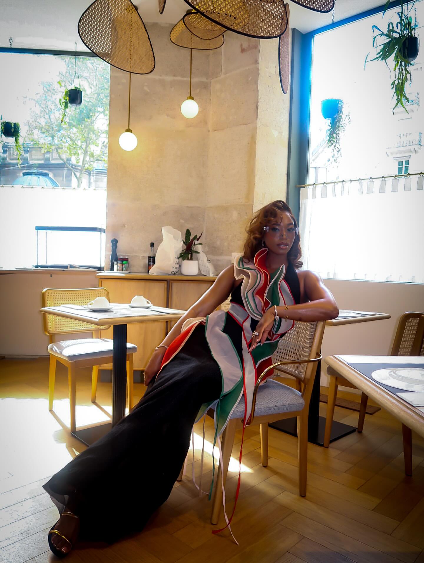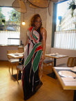 This striking maxi dress exudes artistic flair. It features an asymmetrical neckline and one-shoulder design. The bold, vibrant geometric pattern, combined with flowing green, red, white, and black colors, creates a captivating visual effect. The elegant silhouette and floor-length skirt add a touch of luxury. This dress perfectly blends artistry and elegance, making it the perfect choice for a stylish look at special occasions or events.