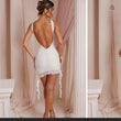 Asymmetric Ruched Bodycon Dress with a high - neck, sleeveless design. The dress features ruched detailing that creates a form - fitting silhouette, and an asymmetric hemline with ruffled accents on the right side, adding a touch of flair. A decorative tie is also present on the right shoulder. This dress is suitable for semi - formal events like cocktail parties or evening gatherings, offering a combination of elegance and modern style.