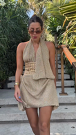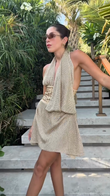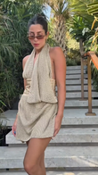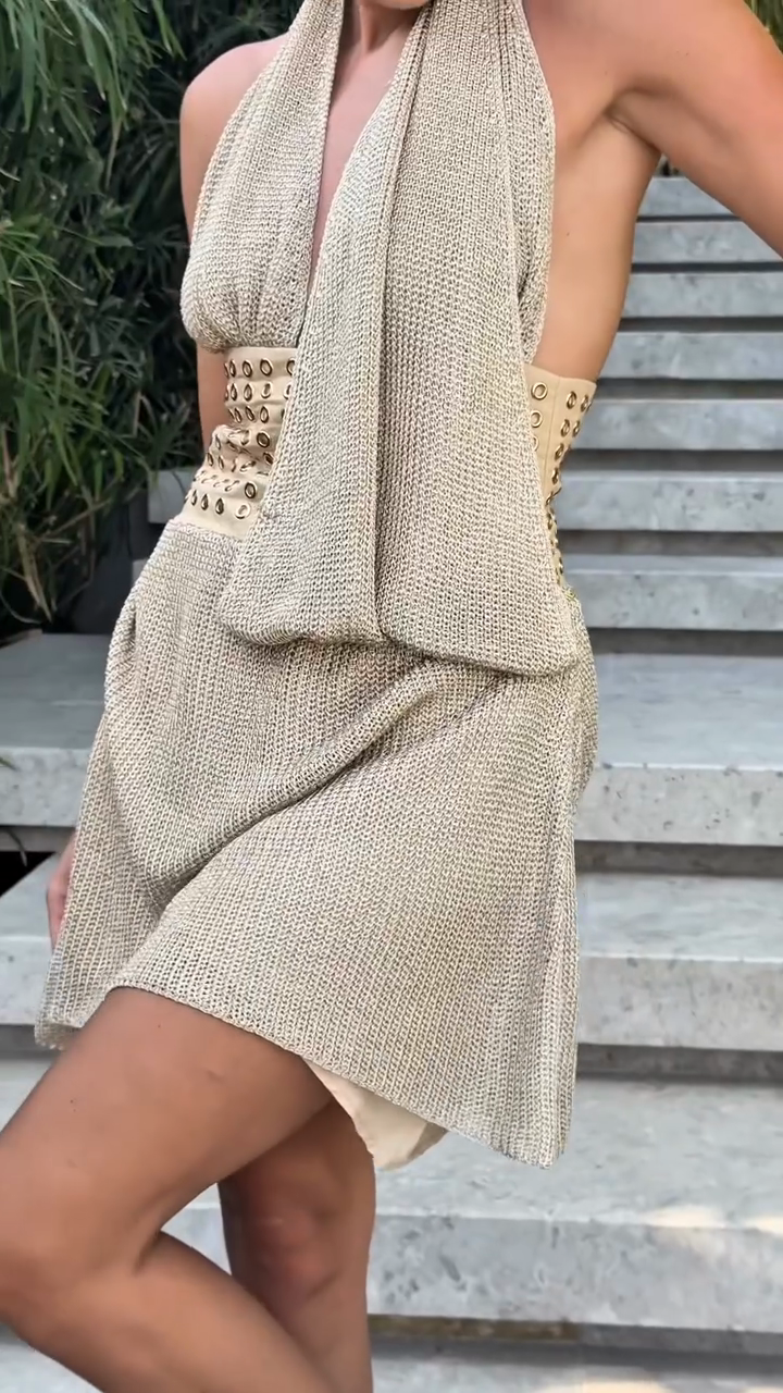 Beige Halterneck Knit Mini Dress with Studded Belt