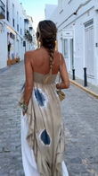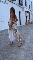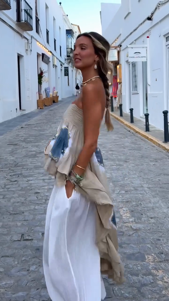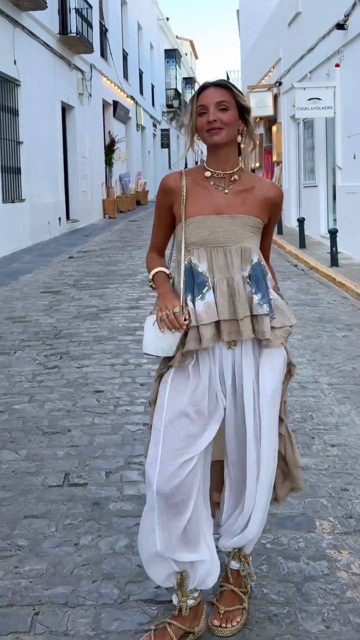 Beige Ruffled Strapless Top and White Harem Pants Set