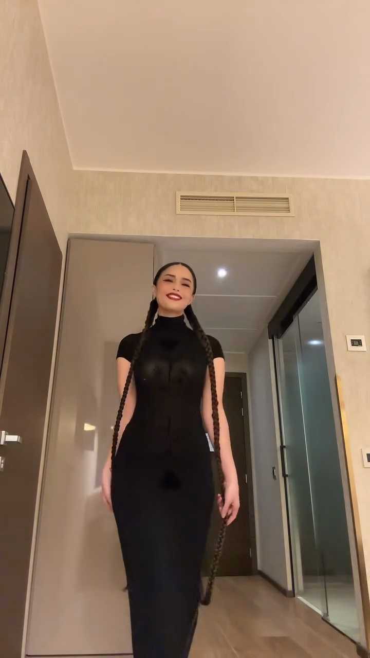 The dress's stretch fabric ensures a comfortable, close fit, while the long skirt adds an elegant, flowing touch.