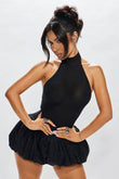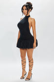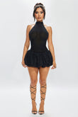 This black mini dress features an open back and a sheer mesh bodice for a flattering, modern look. The tutu adds playful volume, complementing the smooth texture of the bodice.
