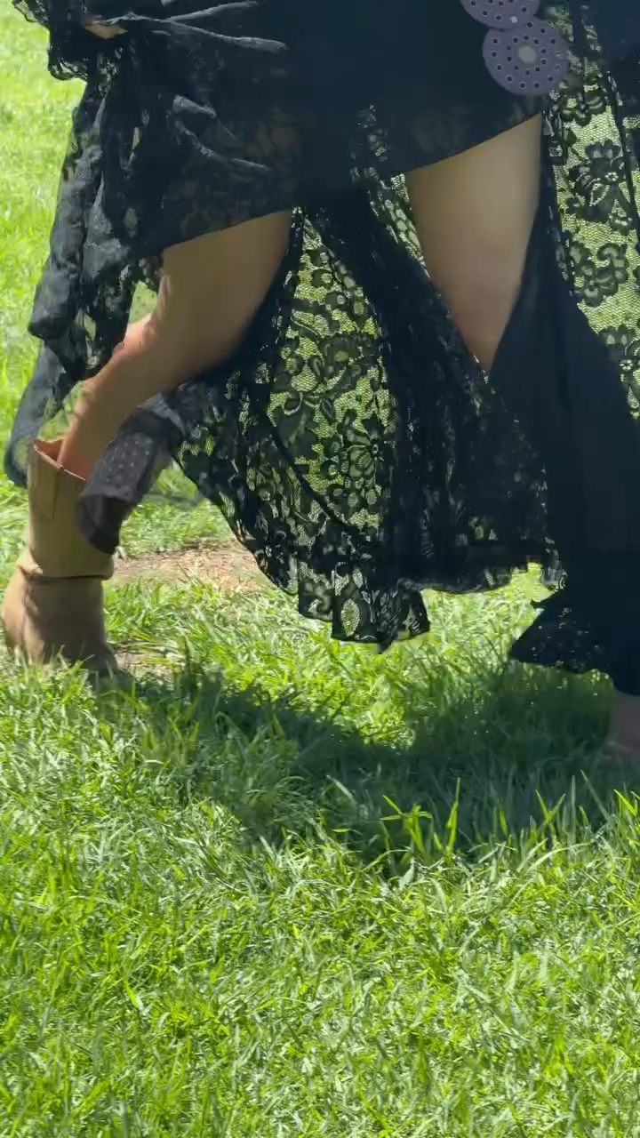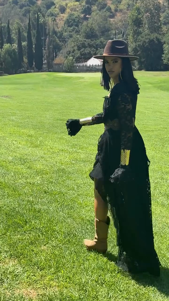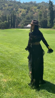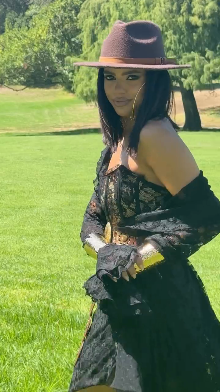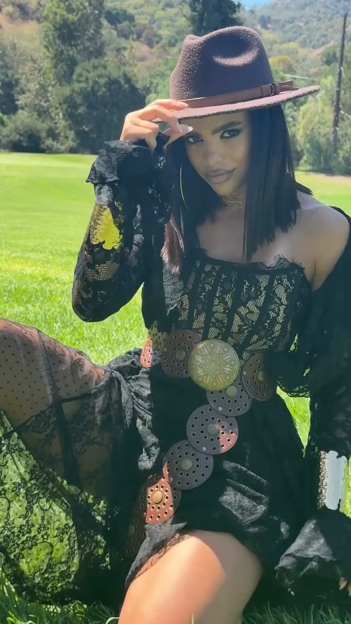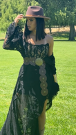 Black Lace Bohemian - Style Dress Outfit dress with an asymmetrical design, featuring a one - shoulder, long - sleeve style on one side and a strapless look on the other. The dress has a high side slit, revealing one leg. It's accessorized with a wide belt adorned with large, circular metal and brown - toned embellishments. The individual is also wearing a brown hat, large hoop earrings, and appears to have some metallic arm accessories. Suggesting a bohemian and free - spirited fashion choice, suitable for a music festival, outdoor event, or a stylish casual gathering.