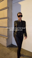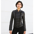 This black leather jacket is inspired by military style. A high stand-up collar adds a sturdy touch. Rows of buttons and horizontal shoulder straps detail the front for a structured, striking look. Epaulettes on the shoulders add a military touch, while a zippered front adds a modern touch. This jacket is crafted from durable leather for a luxurious feel. Perfect for cooler weather, it instantly elevates any outfit and adds a touch of edgy fashion. Pair it with simple black trousers for a sleek, sophisticated look. It can also be paired with a dress or jeans for a versatile look that's perfect for casual outings or evening events.