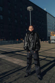 This black leather jacket features an oversized silhouette for a bold, modern look. A high collar adds a touch of toughness, while the zipper front adds both practicality and style. The relaxed fit pairs easily with a variety of tops.