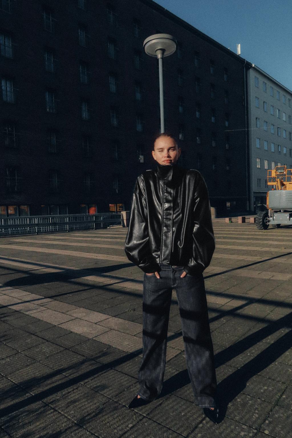 The leather material creates a sculpted silhouette without sacrificing comfort. The oversized silhouette ensures freedom of movement, making it ideal for everyday wear.