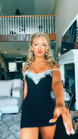 This black mini dress features an off-the-shoulder design for a more feminine and alluring look. The bodice is embellished with delicate pearls, creating a striking contrast against the black fabric.