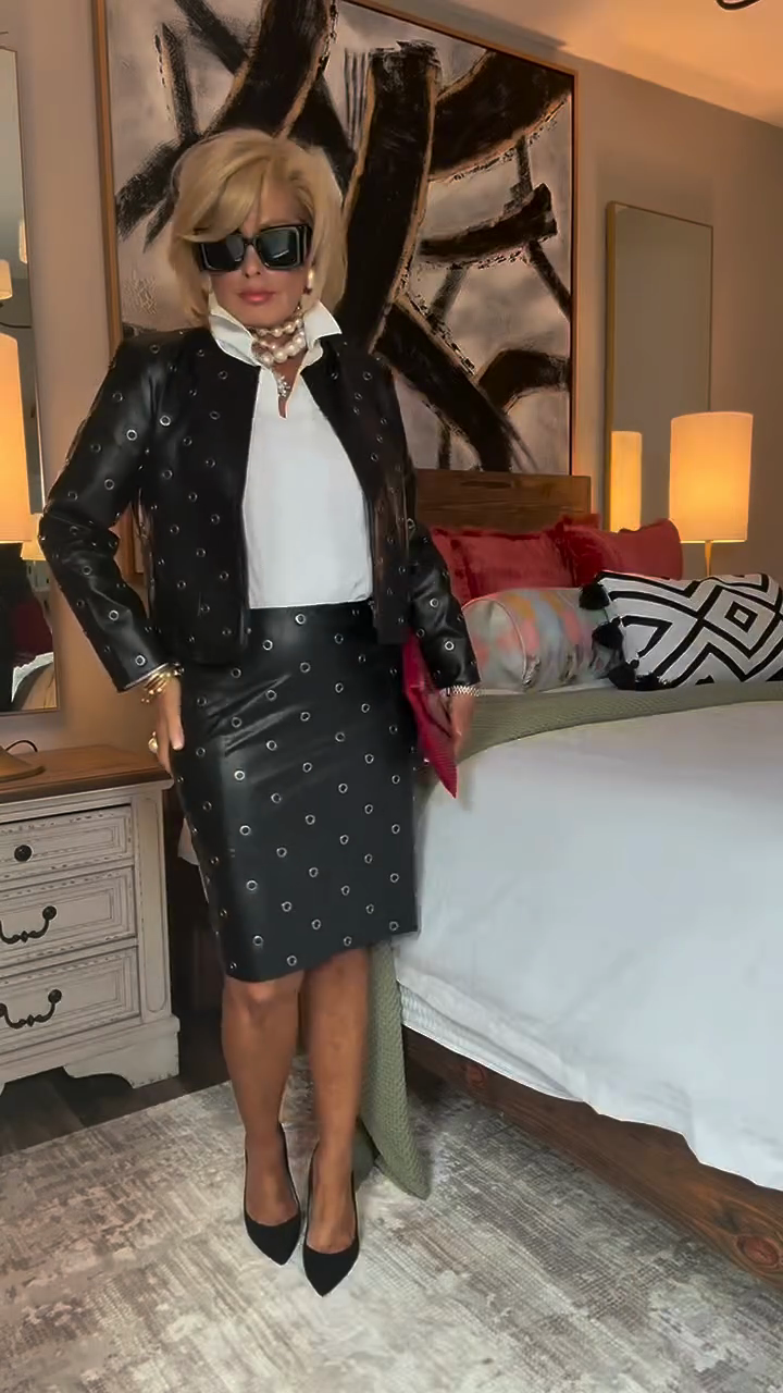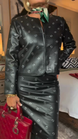 Black Perforated Leather Jacket and Skirt Set