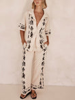 Crafted from a comfortable and lightweight fabric. these pants feature a timeless black base with an elegant cream print for added flair. The wide leg silhouette offers a flattering fit and effortless movement. making them perfect for both casual and dressy occasions.