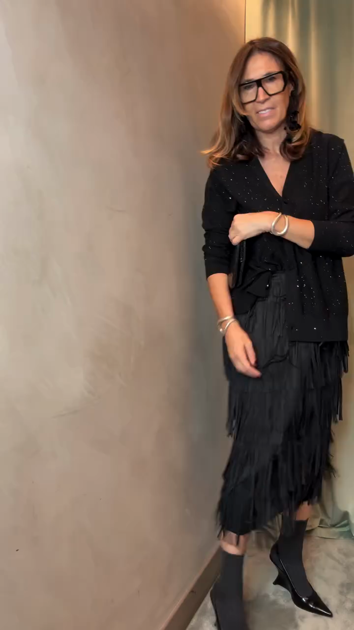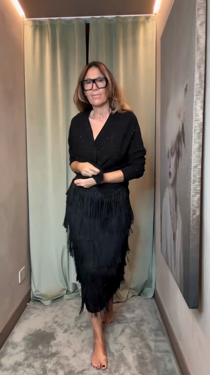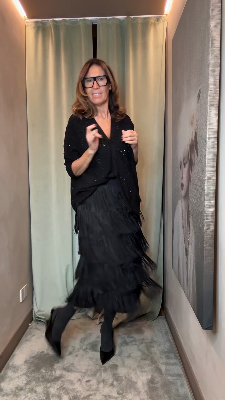 This is a stylish black ensemble. The top is a V-neck cardigan with a shimmering texture, adding a touch of sparkle. Paired with a black midi skirt, embellished with cascading fringe, it creates a dynamic, flowing effect as you move. This outfit is both elegant and playful, perfect for any occasion where you want a stylish, eye-catching look.