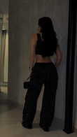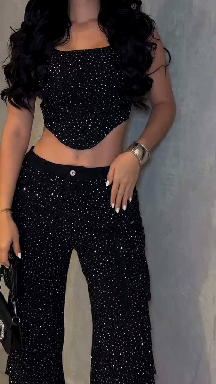 This two-piece set features a black base embellished with shimmering sequins for a dazzling look. The cropped top's unique asymmetrical hem adds a stylish touch, while the high-waisted, wide-leg pants flatter the figure. The slim-fitting top accentuates curves, while the loose-fitting pants mitigate the revealing feel of the top. Perfect for a night out, a party, or any special occasion where you want to make a statement, this set is perfect. As shown, pair it perfectly with silver pointed-toe heels for an extra touch of glamour. Accessorize with simple, sparkling jewelry and a stylish handbag for even more flair.