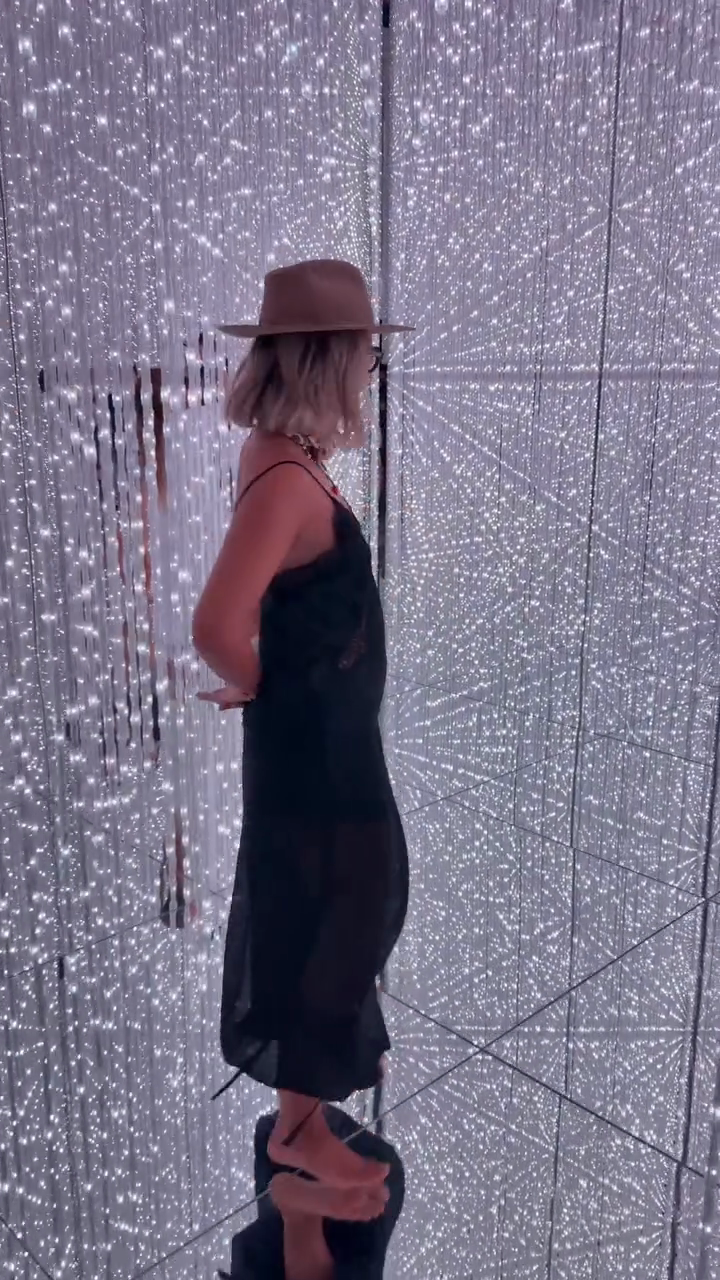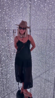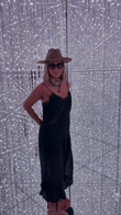 Black Sheer Slip Dress Outfit with a black, sheer - paneled slip dress with lace details. They accessorize with a wide - brimmed hat, sunglasses, a patterned scarf around the neck, and layered necklaces. Illuminated strands creating a sparkling, star - like effect. This outfit combines a bohemian and stylish aesthetic, suitable for a visit to an art space or a creative event.