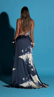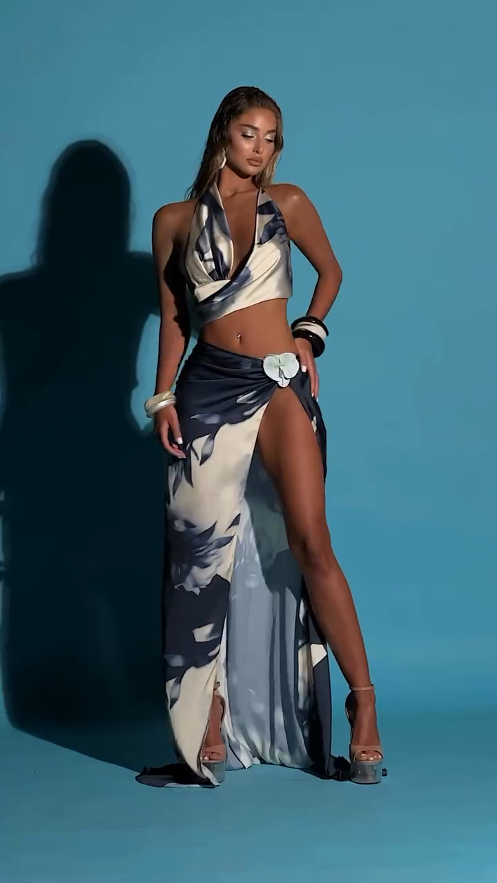 Blue and White Floral Print Halter Top and Slit Skirt Set