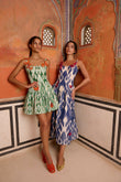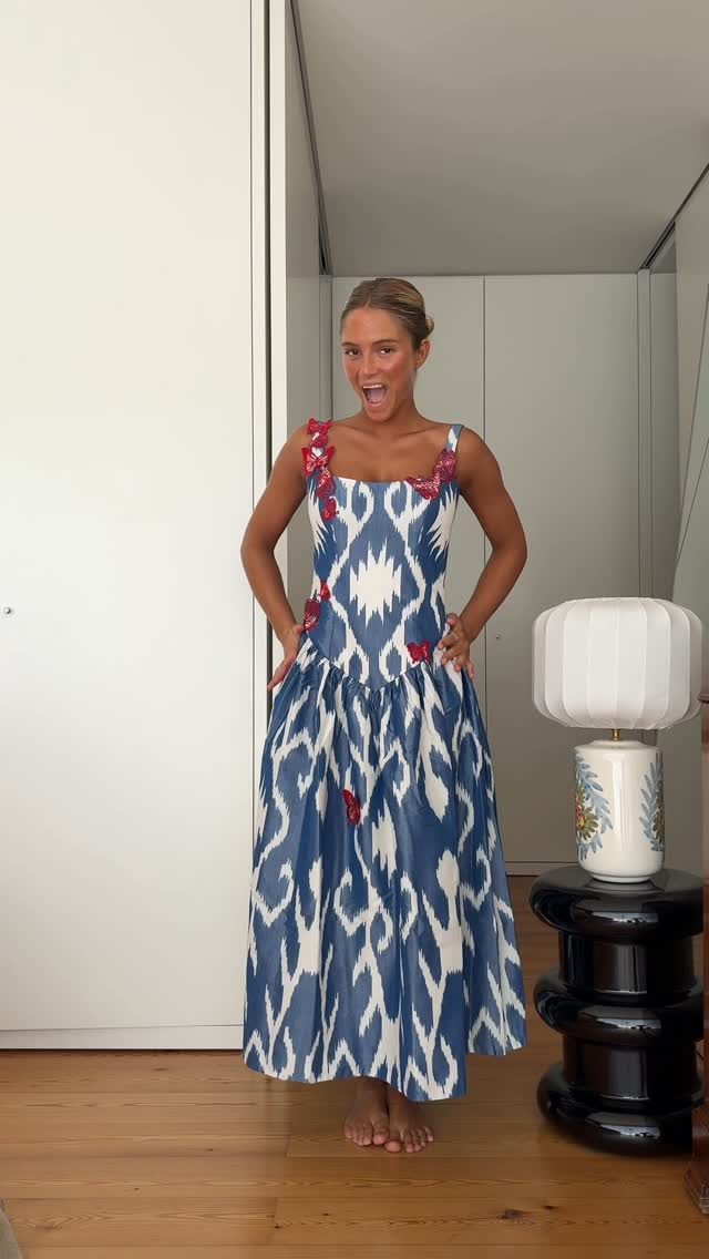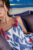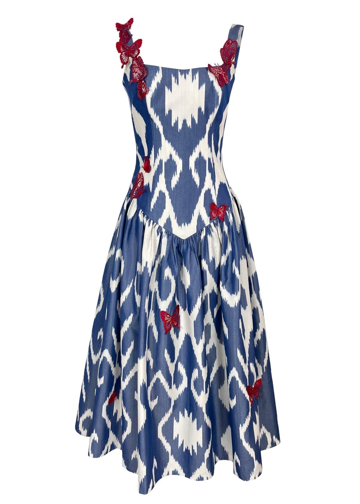 Blue and White Ikat Print Dress with Red Butterfly Embellishments