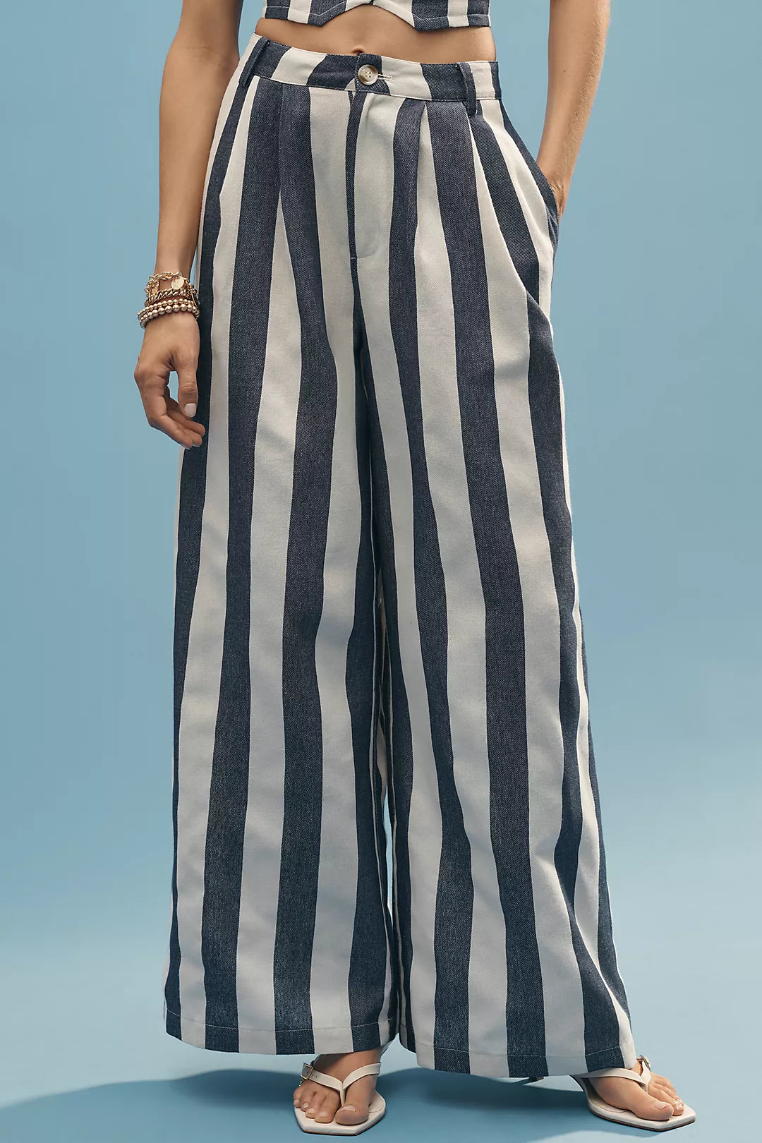 Elevate your beach and resort wardrobe with this Blue and White Striped Bandeau Top and Wide Leg Pants Set. The bandeau top with button details, matching wide - leg pants, and nautical stripes create a chic, coastal - inspired look. Perfect for beach vacations, seaside strolls, or summer getaways. Pair with minimalist sandals and a straw clutch to complete the effortlessly stylish ensemble.