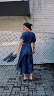 This outfit consists of a blue wrap - style crop top and matching high - waisted wide - leg pants, both featuring a floral pattern. Paired with a straw bucket hat, sunglasses, and carrying a woven straw tote bag, along with wearing platform sandals, it creates a relaxed, summery look perfect for a tropical or beachside environment, suitable for casual outings, beach walks, or resort - style activities.