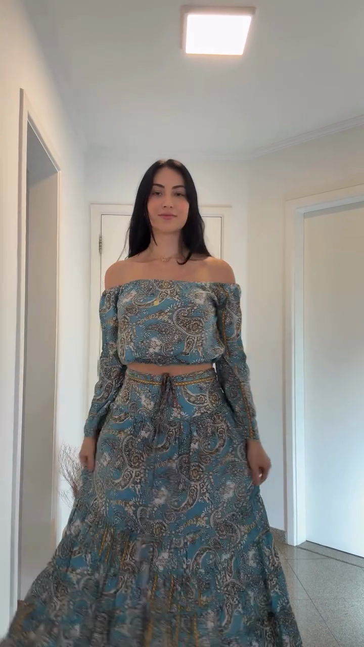 Blue Paisley Off - Shoulder Crop Top & Maxi Skirt Set