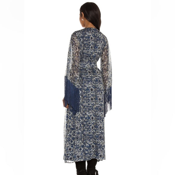 Blue Printed Sheer Sleeve Maxi Dress with Slit