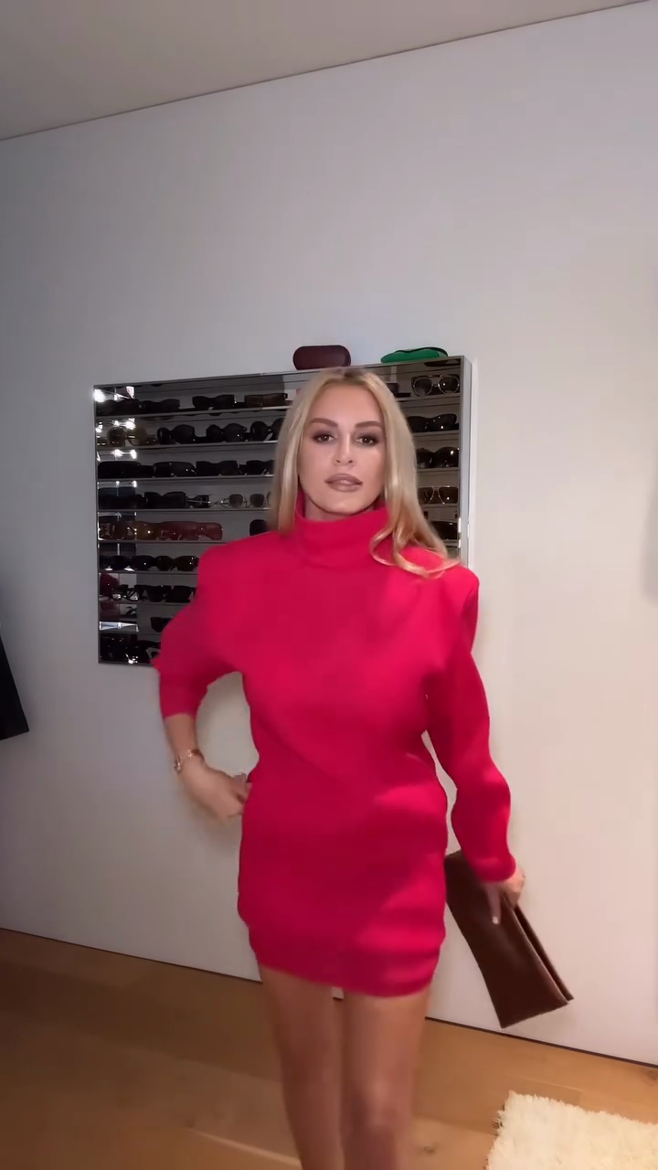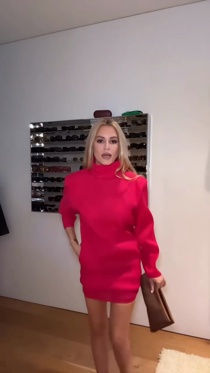 This bright red mini dress features a high neckline and a slightly loose fit for a bold and stylish look. The long sleeves provide warmth and comfort, adding a touch of sophistication, making it the perfect choice for cooler weather.
