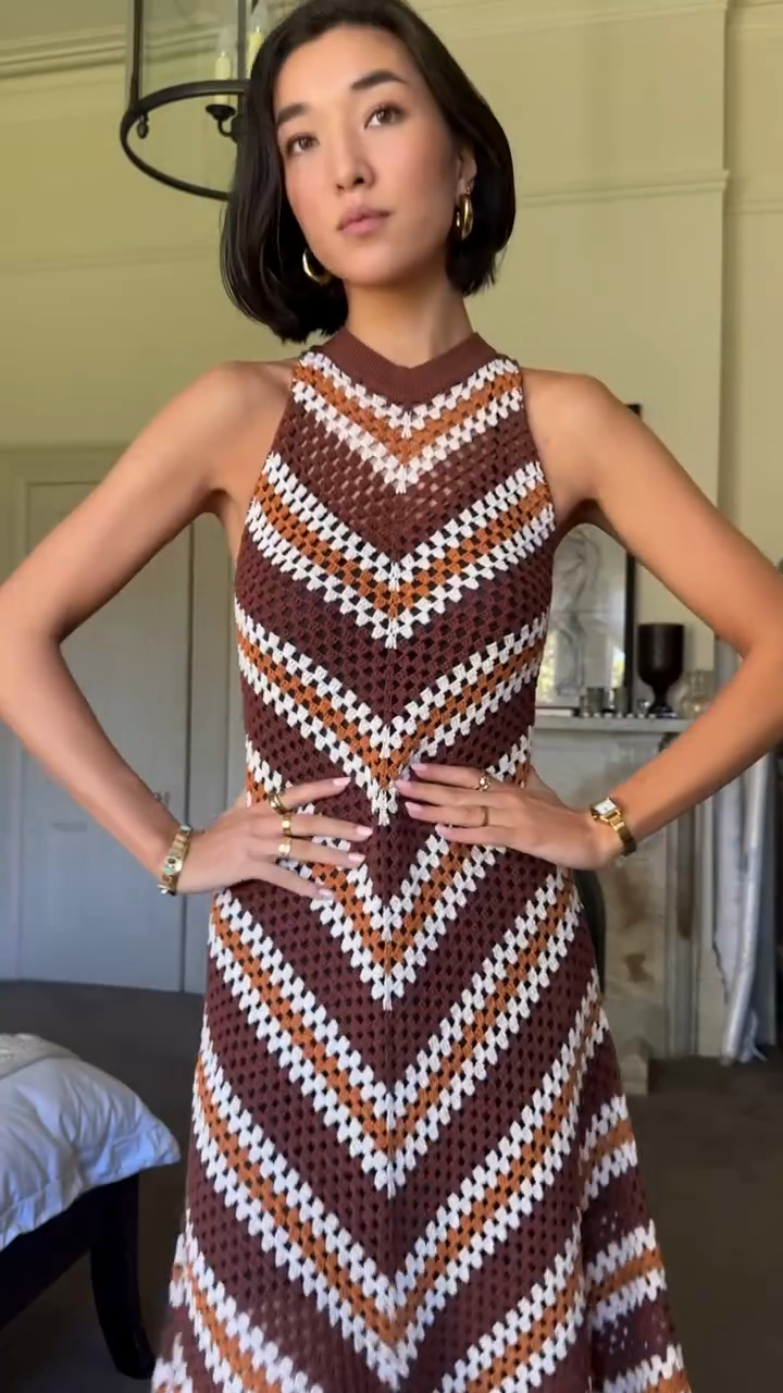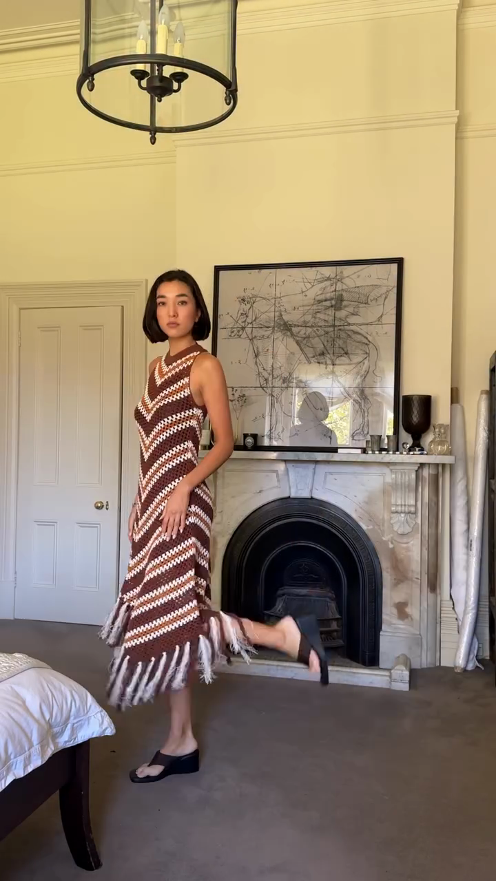 Brown and White Crochet Sleeveless Fringe Midi Dress