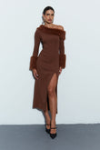 Brown Faux Fur Trim Off The Shoulder Midi Dress
