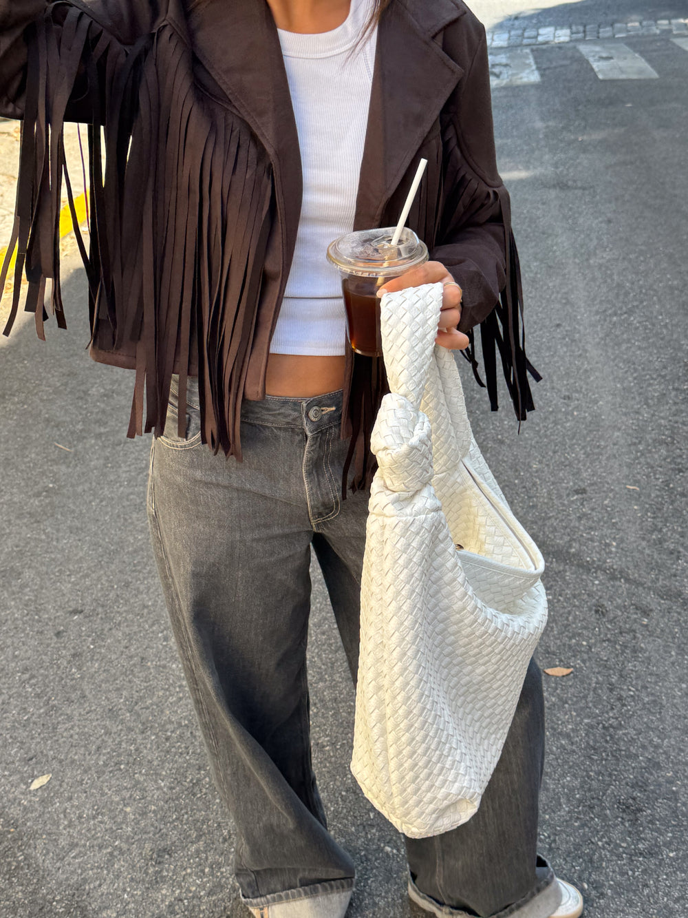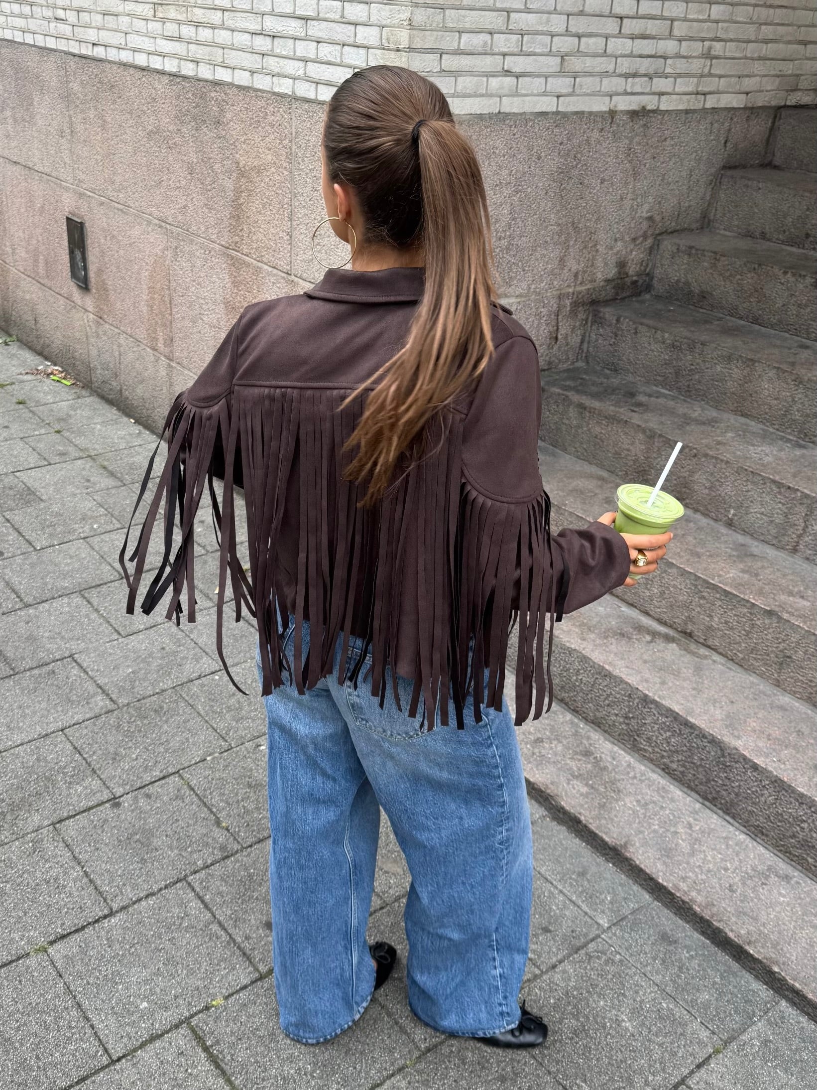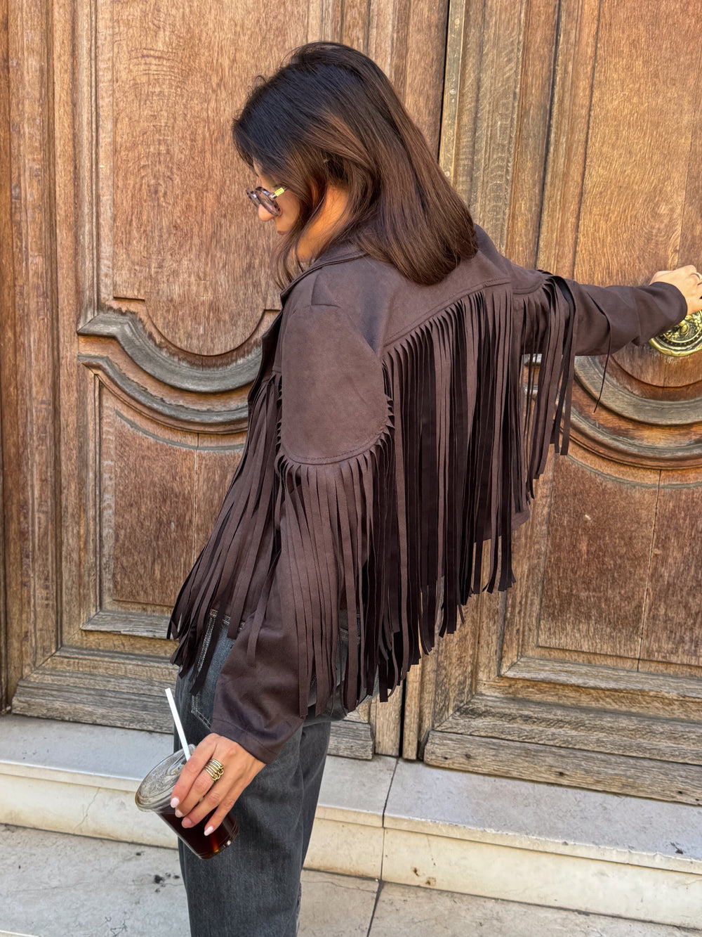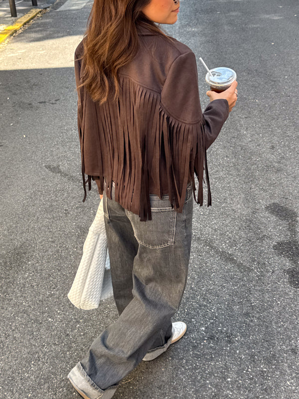 Add a boho - chic touch to your wardrobe with this Brown Fringe Suede Jacket. The fringe detailing and suede texture create a trendy, western - inspired look. Perfect for layering over tees or tanks. Lightweight design ensures fast page load. Shop now for a stylish, versatile piece!
