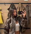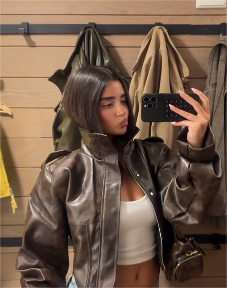 This brown cropped leather jacket features a high stand-up collar for a sleek, sophisticated look. The relaxed silhouette creates a stylish, casual cool, while the cropped length pairs perfectly with high-waisted bottoms. Crafted from durable leather, this jacket offers a luxurious feel. The button-down front and minimalist detailing highlight the leather's natural grain and color. Perfect for everything from casual outings to evening outings, this jacket pairs perfectly with a simple white crop top and jeans for a classic, modern look. Accessorize with a compact handbag for added flair.