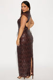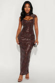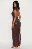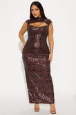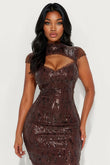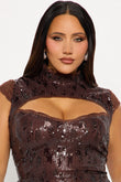 This captivating brown sequined gown features a high neckline, short sleeves, and a unique bust cutout. Its slim fit perfectly accentuates the wearer's curves. The dense sequins shimmer under the light, creating a gorgeous, eye-catching effect. Paired with simple strappy high-heeled sandals and a silver clutch, this look is perfect for formal occasions like gala dinners, award ceremonies, and high-end parties. The sequins create a metallic effect, while the base fabric is a slightly stretchy silk or similar fabric for a comfortable, close-fitting fit.