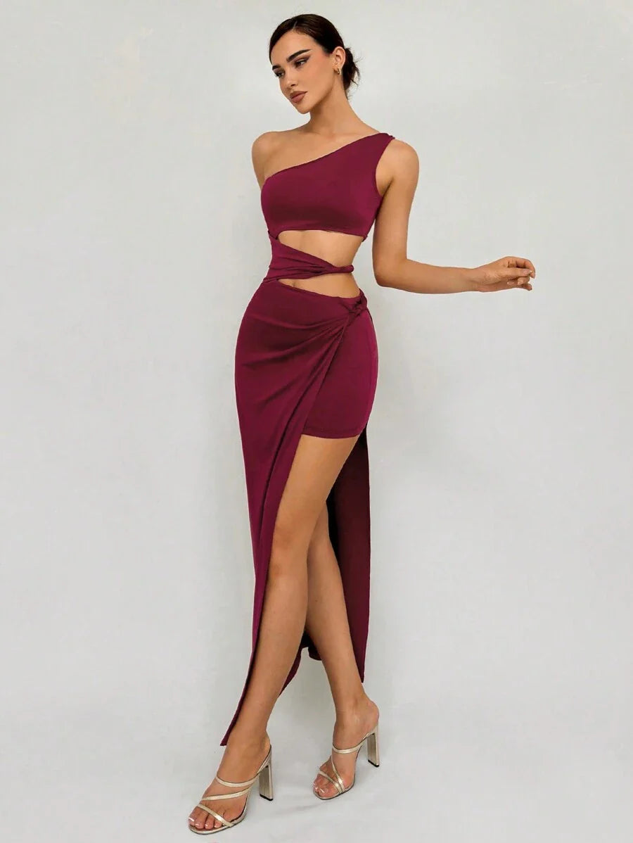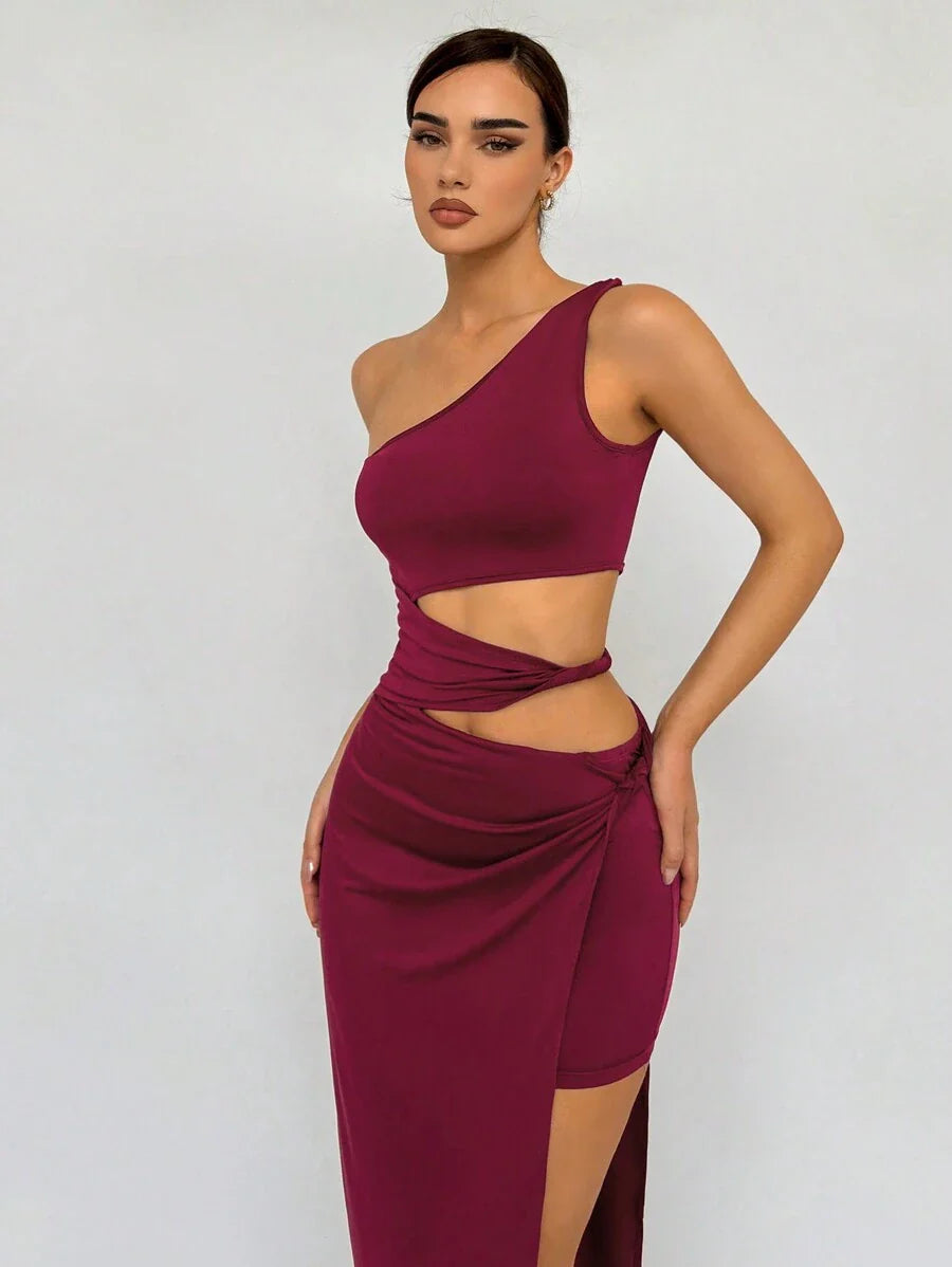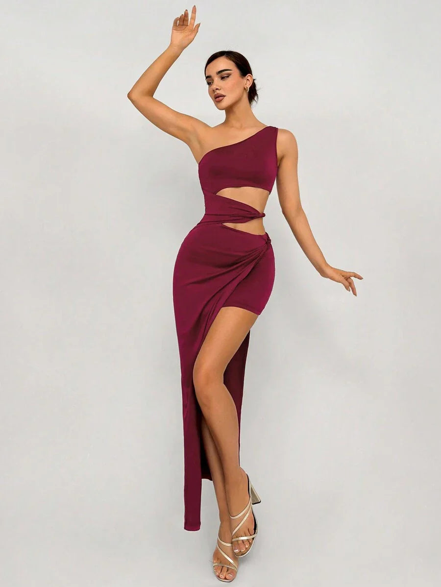 Make a bold entrance in this Burgundy One - Shoulder Cut - Out Maxi Dress. The asymmetric neckline, strategic cut - outs, and sleek silhouette create a sexy, modern look. Perfect for cocktail parties or formal events. Lightweight fabric ensures fast page load. Shop now for a head - turning, elegant outfit!