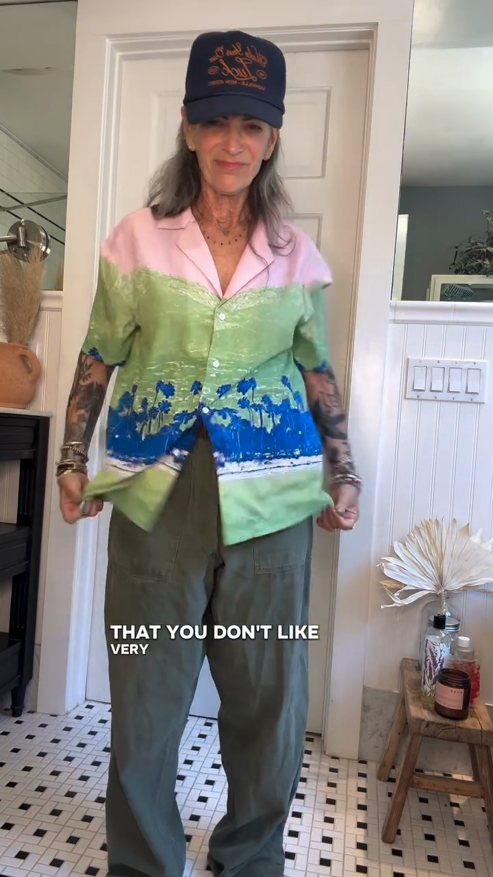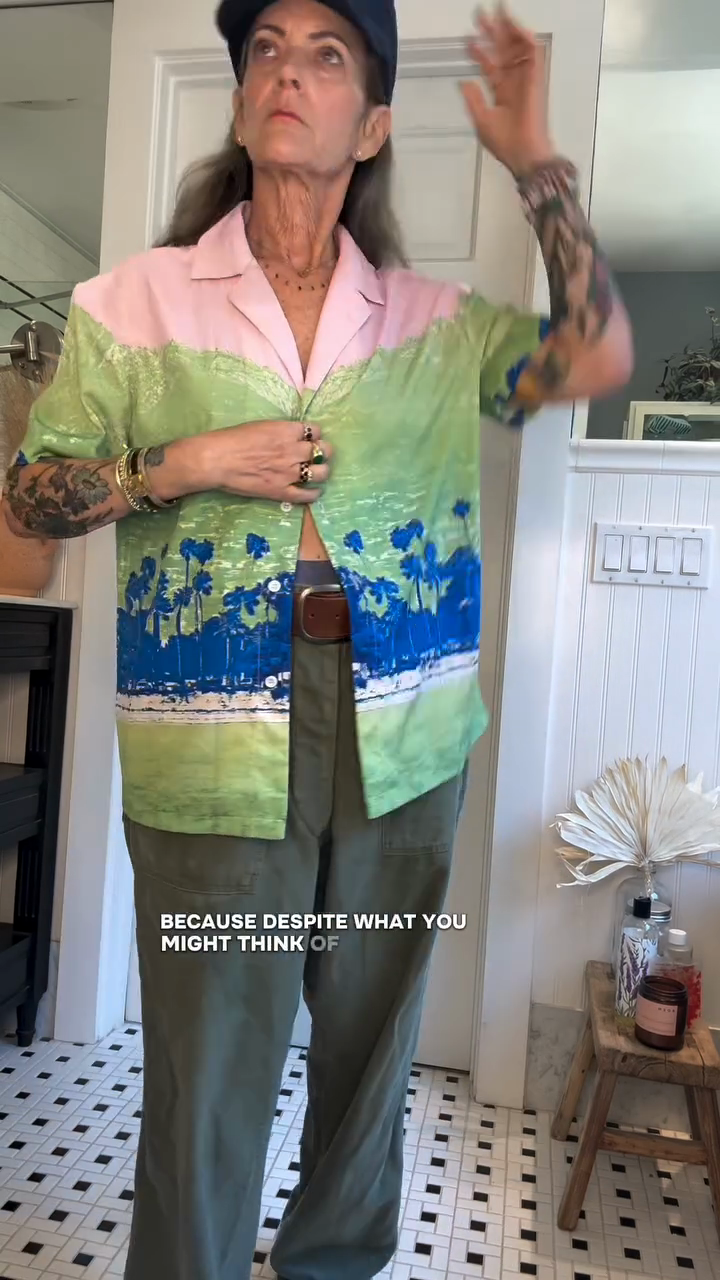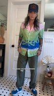 This outfit features a short - sleeved button - up shirt with a vibrant graphic print that includes shades of pink, green, and blue, depicting palm trees and a beach scene. The person is also wearing a dark baseball cap, and accessorized with multiple bracelets on both arms. This look is suitable for a relaxed, casual day out, perhaps running errands or meeting friends in a casual setting.