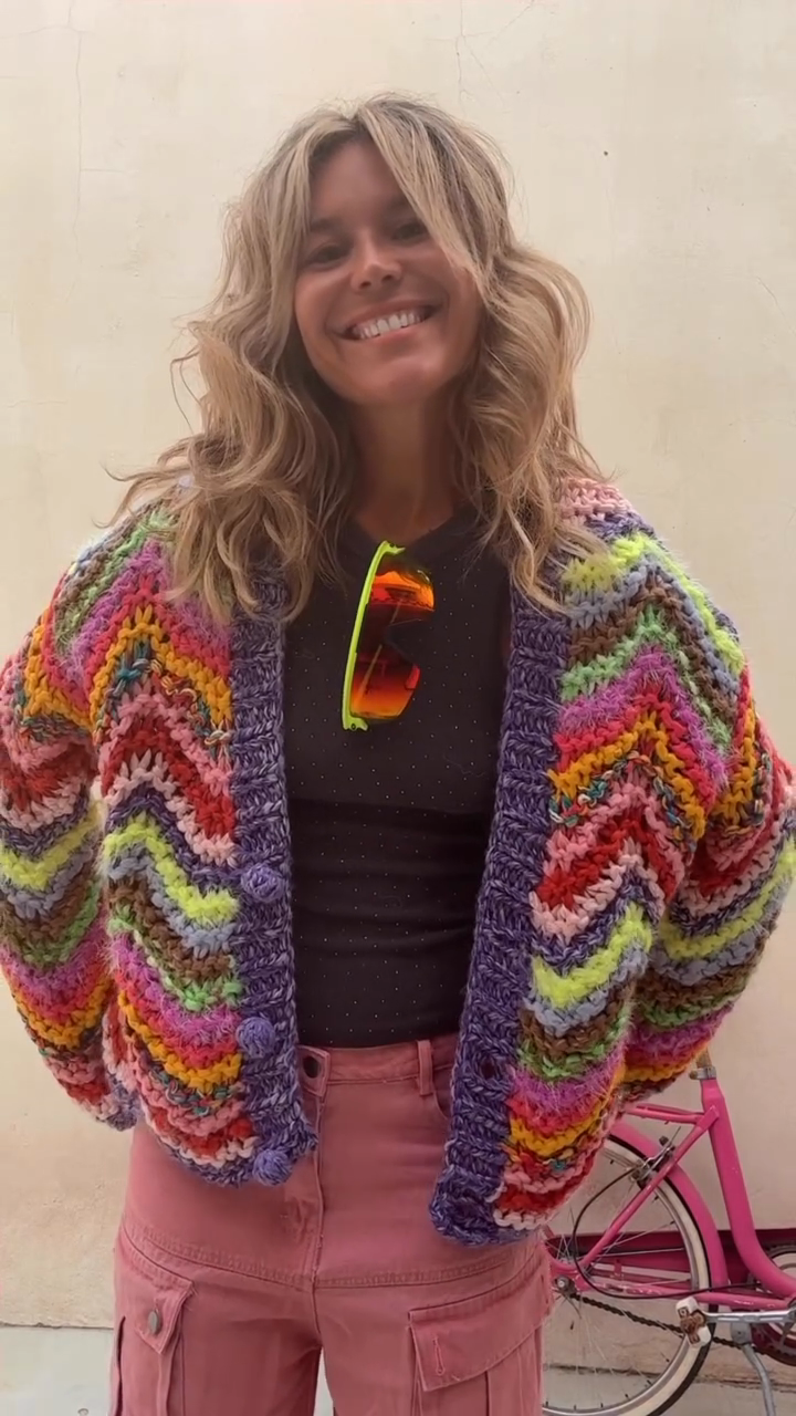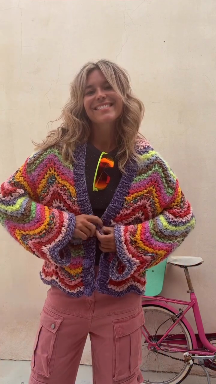 Pair it with pink overalls and a black top, then accessorize with bright accessories for a playful and stylish look. Whether you're on a casual outing, strolling along the coast, or simply going out for the day, this cardigan will easily become a statement piece in your wardrobe.
