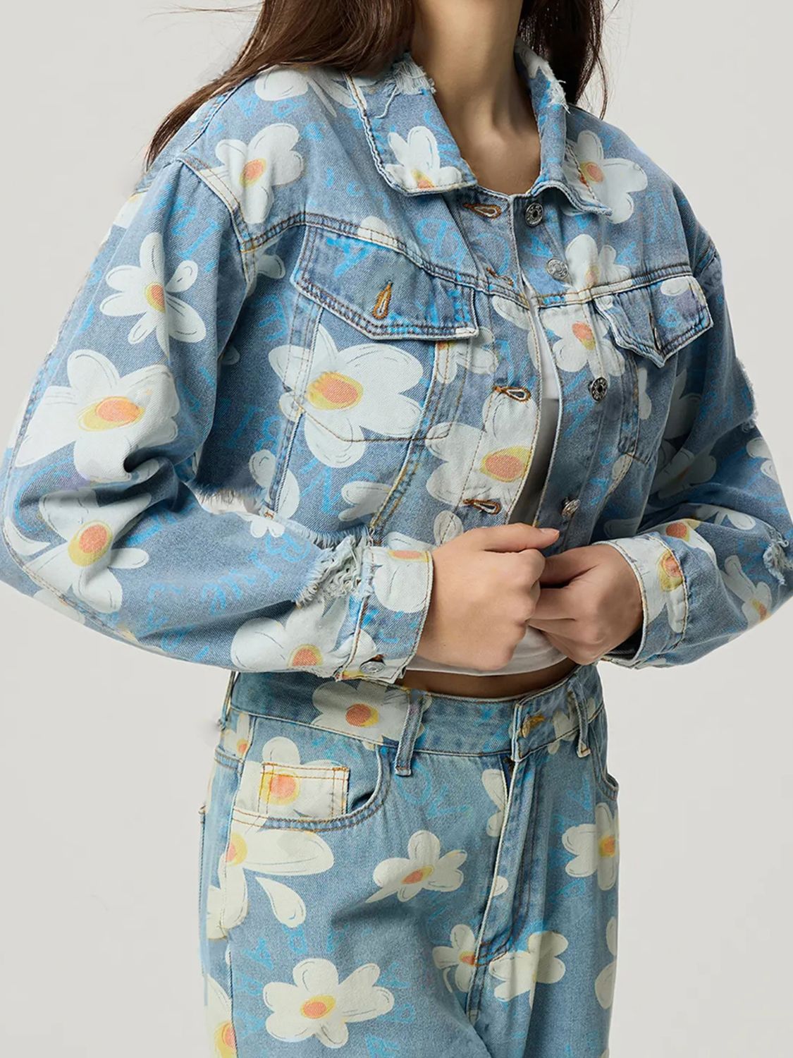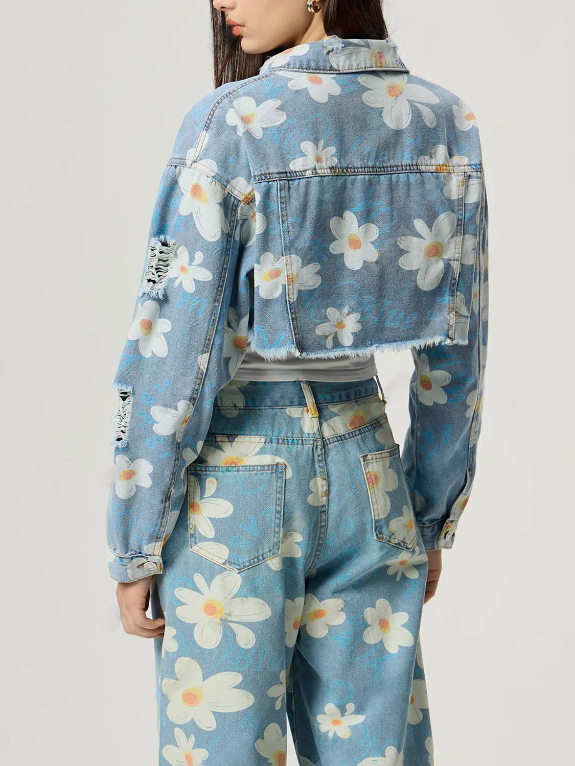 Daisy - Printed Cropped Denim Jacket & Jeans Set