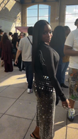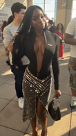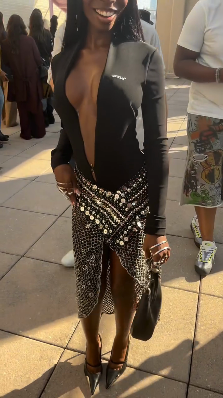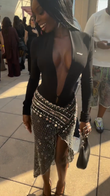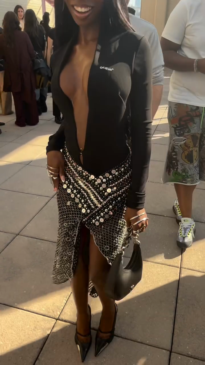 This is a striking two - piece set. The top is a black bodysuit with an ultra - deep V - neckline, exuding boldness and sexiness. It has long sleeves and a form - fitting cut that hugs the body. The skirt is the highlight, made of chainmail and decorated with countless glittering sequins and beads, creating a dazzling effect. It features an asymmetric cut with a slit, adding a sense of style and dynamism. The bodysuit seems to be made of a stretchy fabric, ensuring a snug fit. The chainmail skirt, with its sequin and bead embellishments, has a textured and shiny appearance, likely feeling slightly weighty yet still allowing for movement. This set is perfect for high - end events or nights out. Paired with a small black handbag and high - heels, it can make a glamorous statement, ideal for occasions where one wants to stand out with a bold and shiny look.