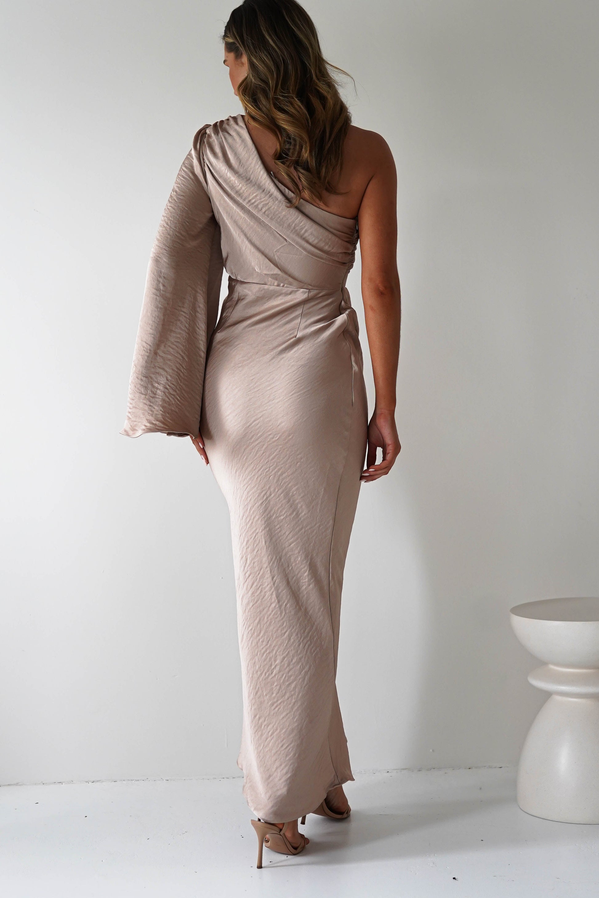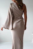 Ideal for formal occasions, weddings, debs and prom, this dress pairs perfectly with understated jewellery and heels for a timelessly elegant ensemble. The luxurious silky fabric drapes beautifully, accentuating your curves with a tailored fit. A single flowing sleeve adds a dramatic yet refined flair, while the asymmetrical neckline and gathered detailing create a look that is effortlessly chic.