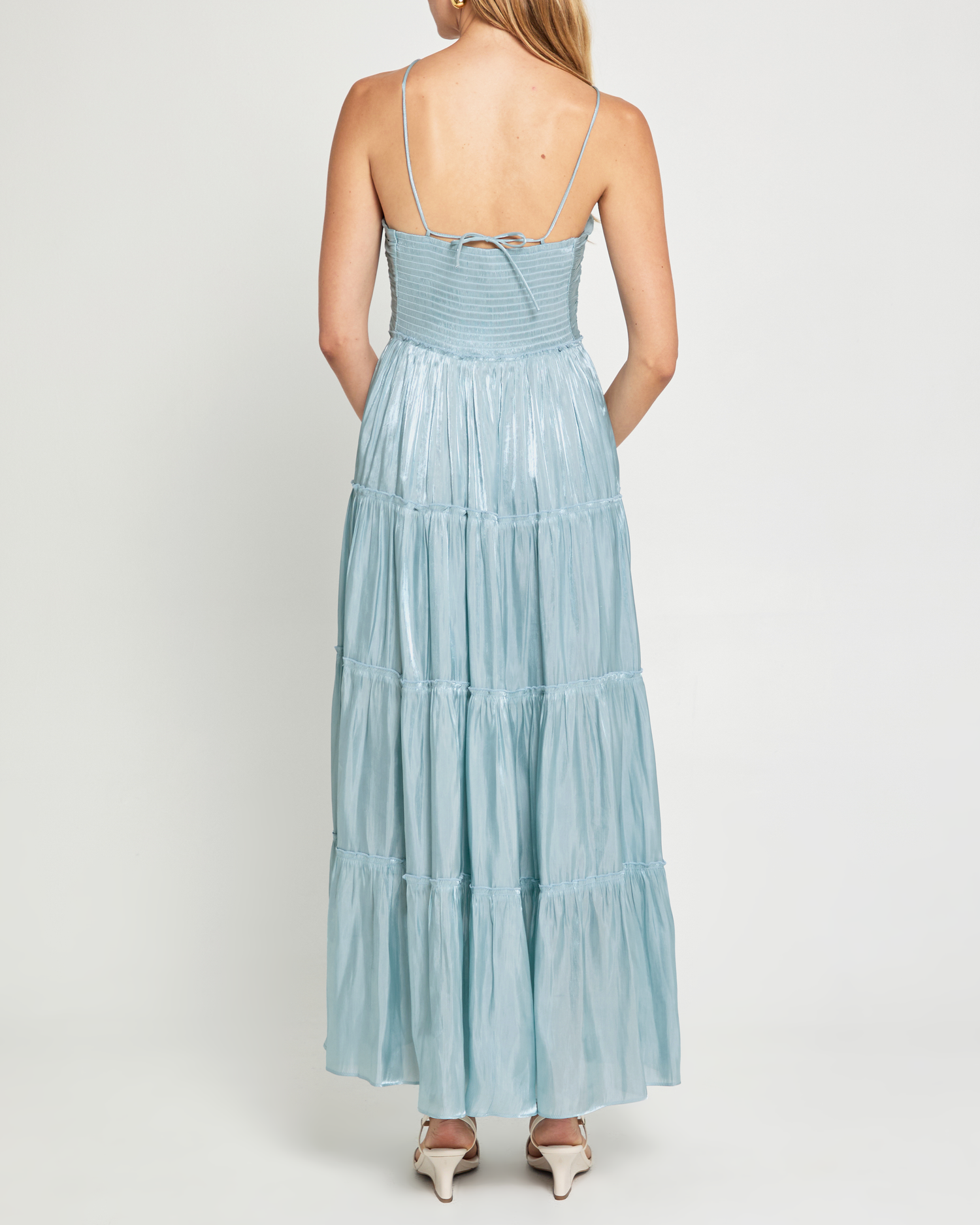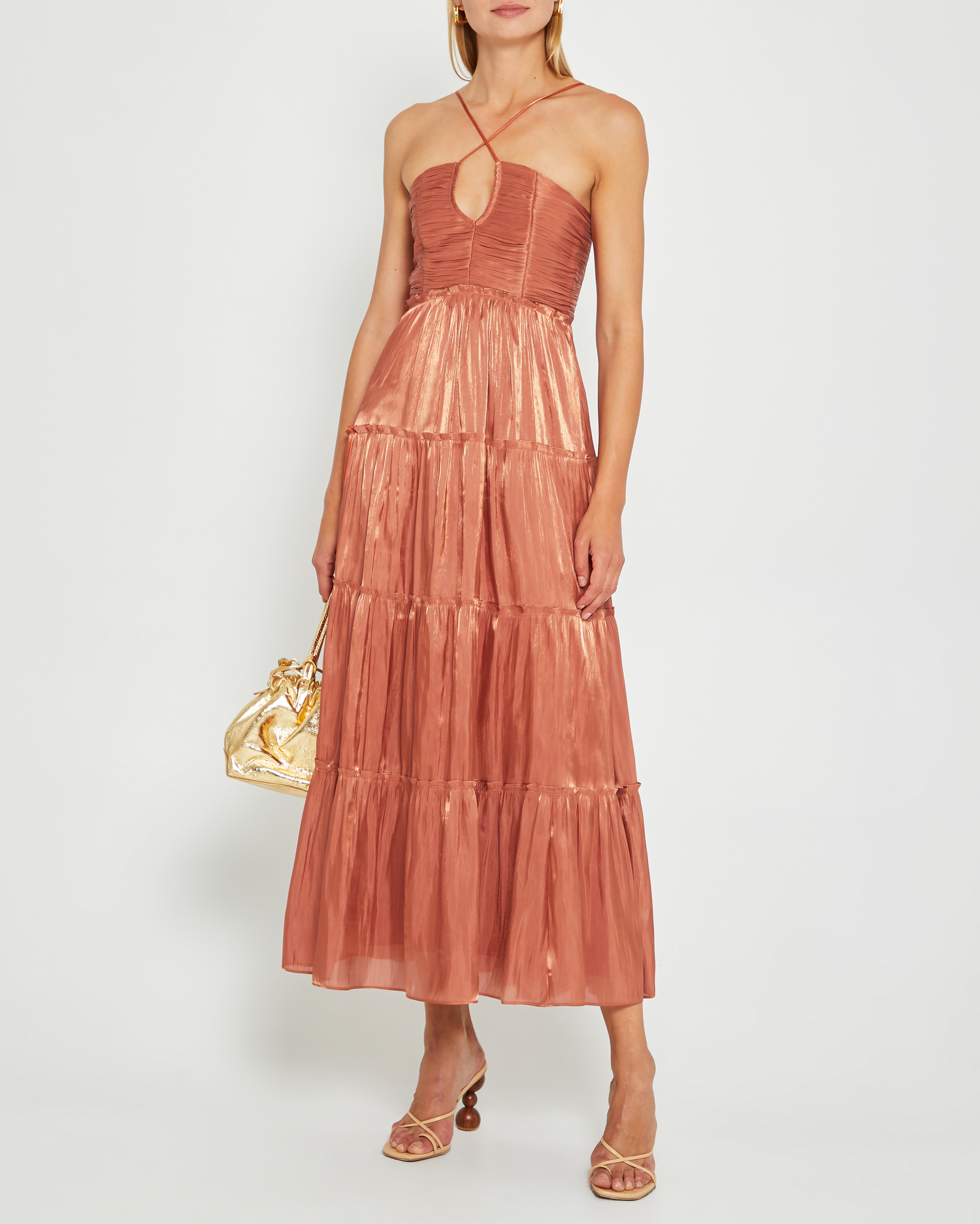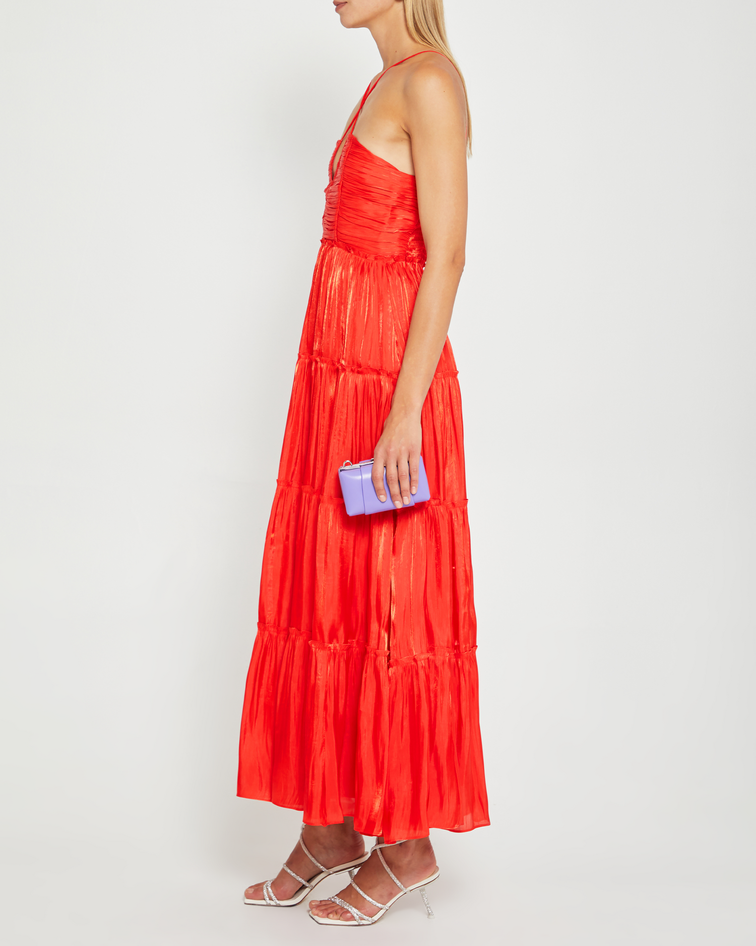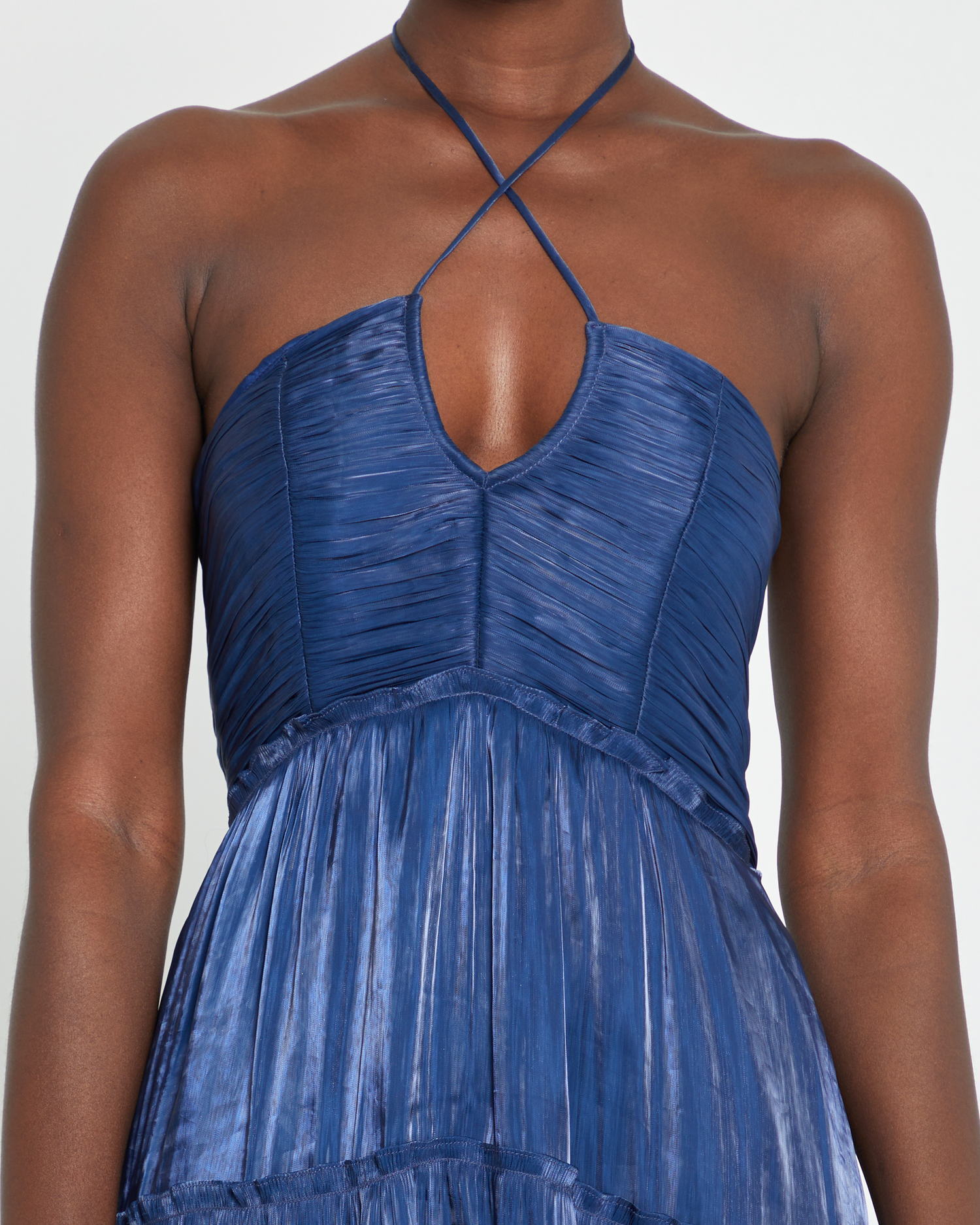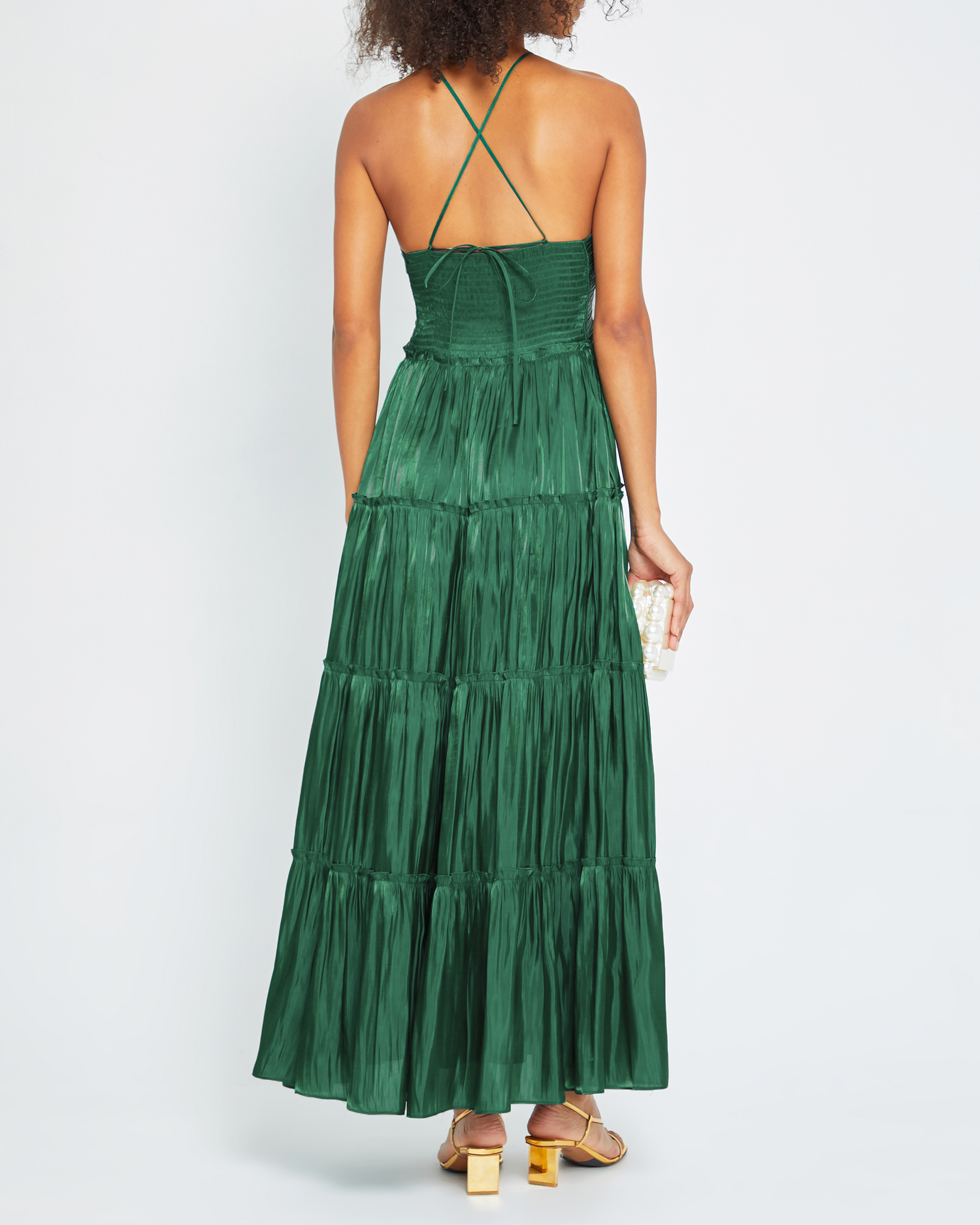 - Design: halter neck with criss - cross back straps, ruched bodice, tiered maxi skirt, shiny fabric