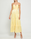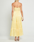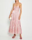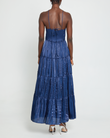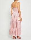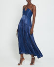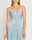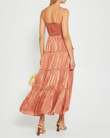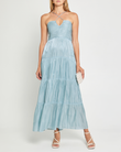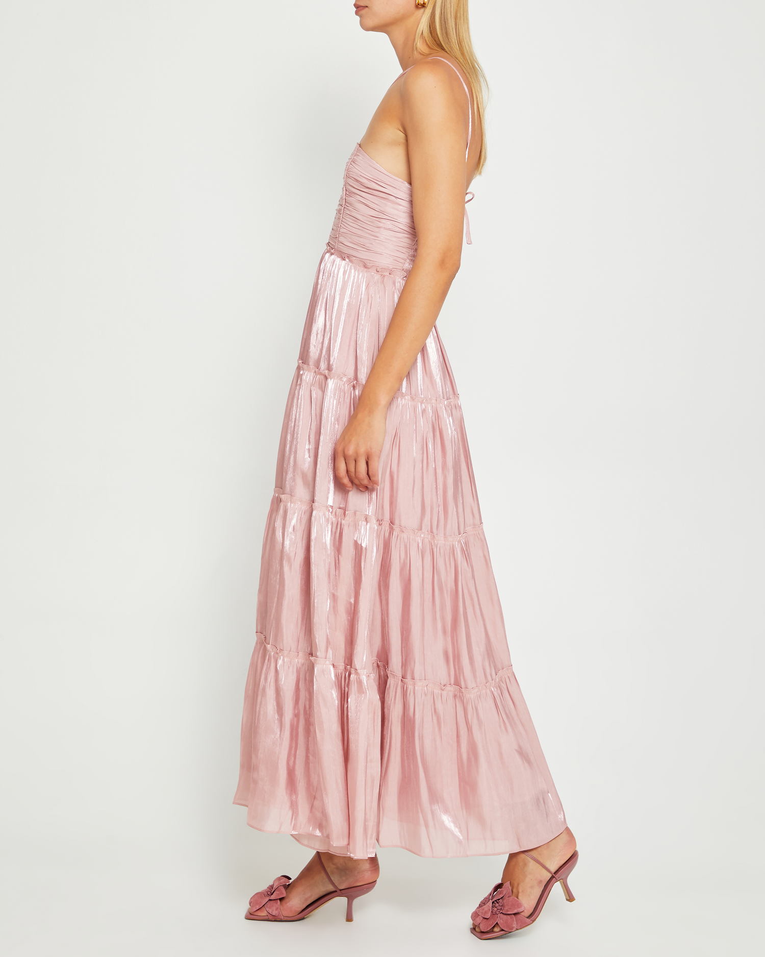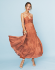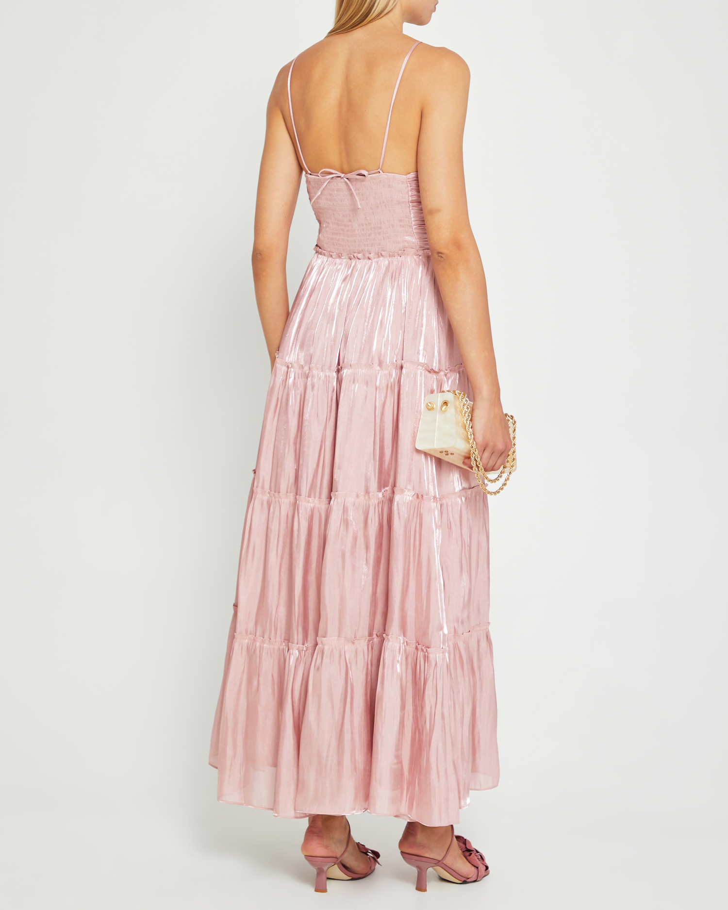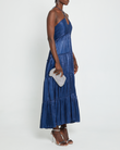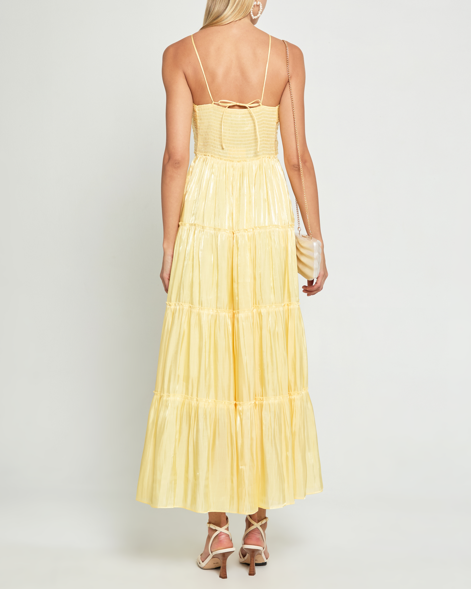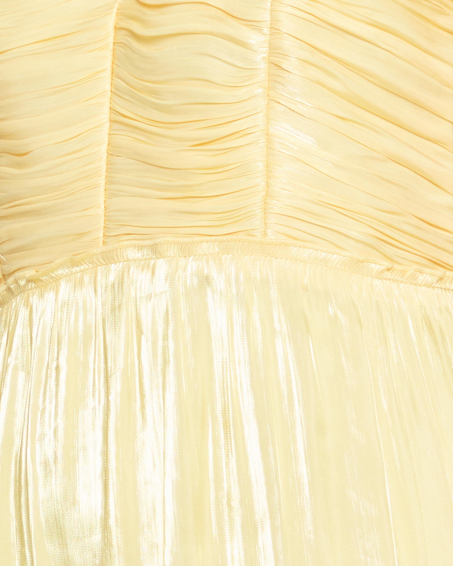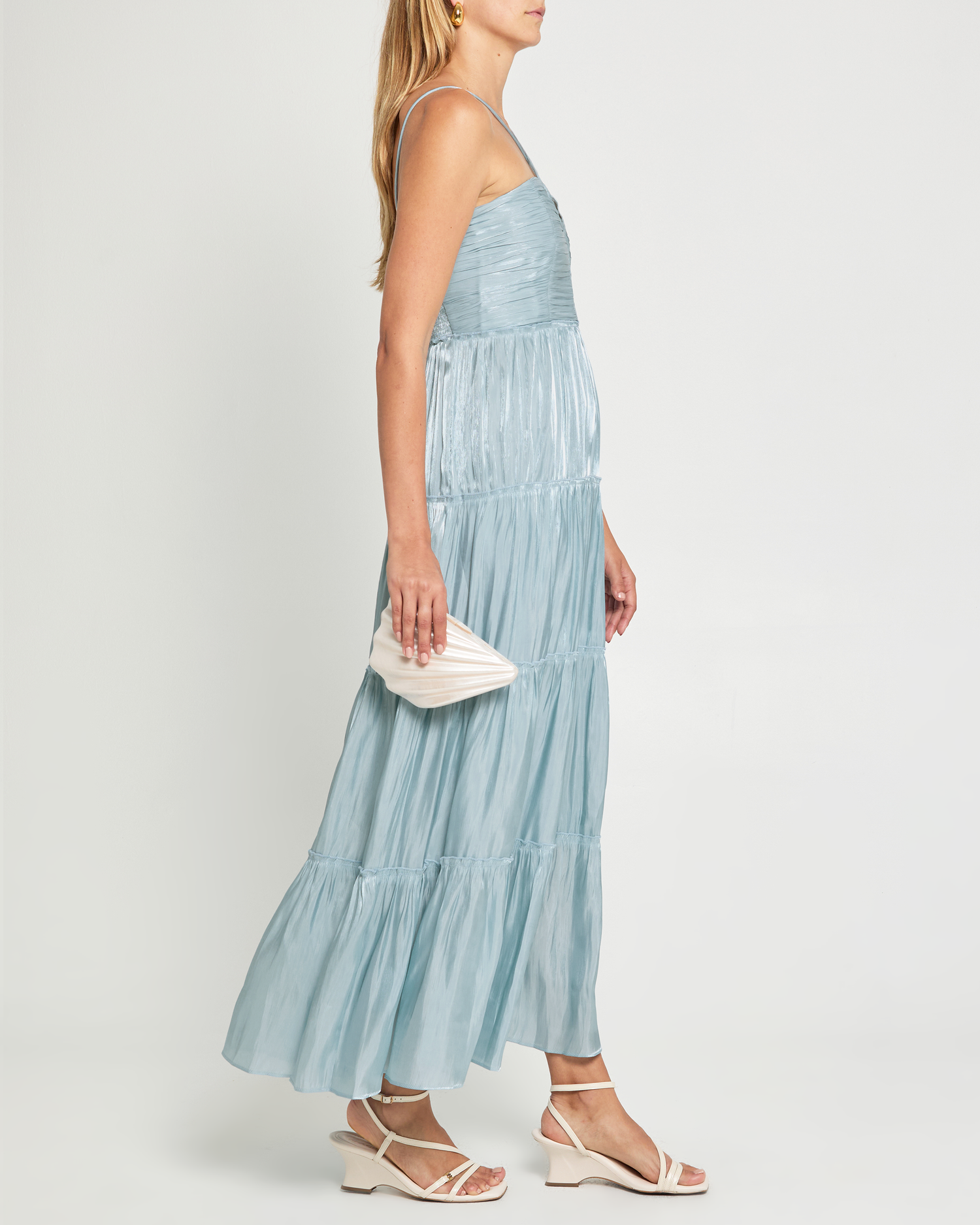- Design: halter neck with criss - cross back straps, ruched bodice, tiered maxi skirt, shiny fabric