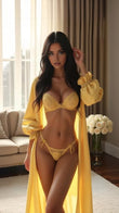 Indulge in elegance with this Elegant Yellow Lace Lingerie Set . Featuring intricate lace detailing, flirty tie-side thong, and a flowy long robe with ruffled sleeves, this set combines sensuality with sophistication. Perfect for romantic evenings, self-care moments, or special occasions. Pair with soft curls and delicate accessories for a refined, alluring look.
