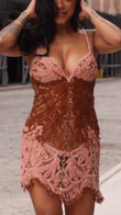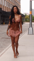 This stunning pink mini dress is adorned with sequins and delicate embellishments. The plunging V-neckline and spaghetti straps accentuate your shoulders, while the fringe detailing at the hem adds a playful, sexy touch. The slim fit hugs the body, flattering your curves. Perfect for a night out, a party, or any occasion where you want to shine and make a statement, this dress is perfect. Pair it with a pair of simple gold, thin-strap heels, as shown, for a look that's sure to turn heads. Accessorize with delicate jewelry to complete the look.