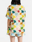 The suit's loose-fitting shirt and matching shorts both feature a unique plaid contrast floral print. Perfect for casual outings or vacation wear. this suit combines comfort with style.