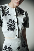 This two-piece set features a puff-sleeved cropped cardigan and a matching maxi skirt, both embellished with a black floral print on a light grey background. The cardigan's button-down design adds a touch of classic charm, while the fitted skirt elevates the overall look.
