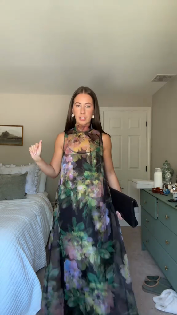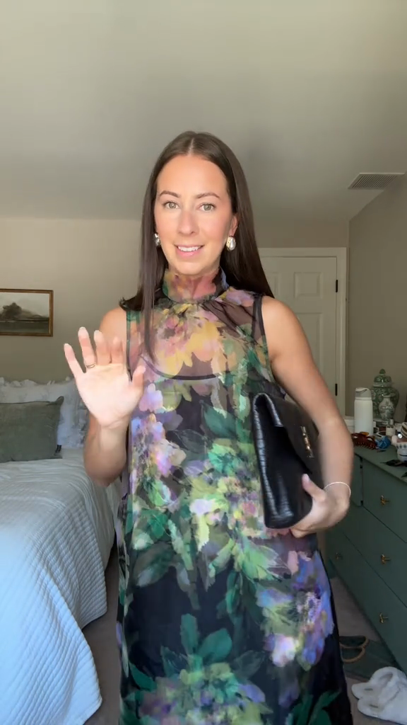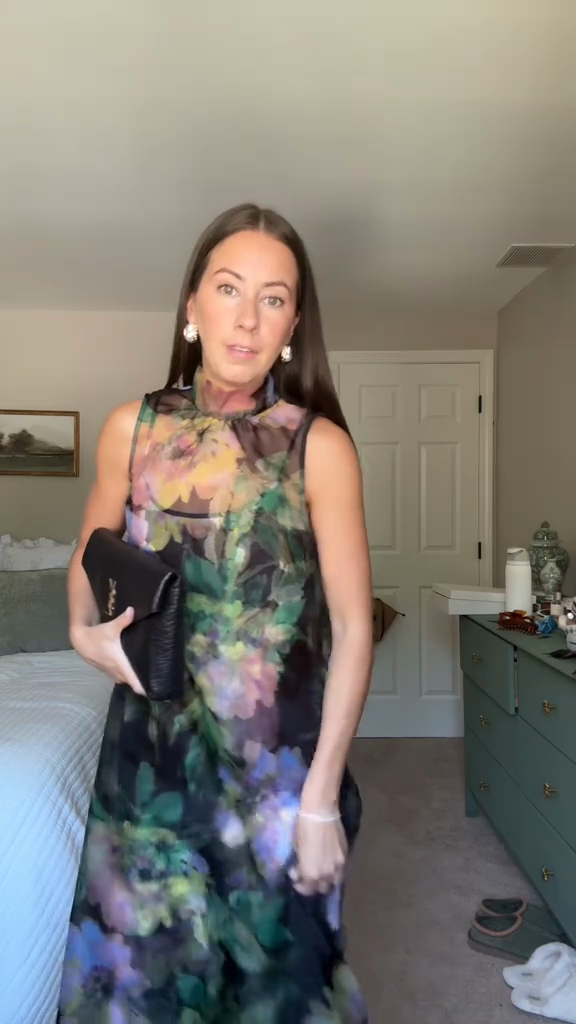 This sleeveless, stand-neck maxi dress adds an elegant touch. The vibrant purple, green, and pink floral pattern creates a naturally romantic ambiance. The loose fit allows for ease of movement during exercise. Skirts are often made from lightweight fabrics like chiffon or silk, offering excellent drape and breathability, perfectly showcasing the delicate colors of the floral pattern while ensuring comfort. This dress is perfect for spring and summer garden parties, vacation getaways, or outdoor weddings. Pair it with simple pearl earrings and sandals for a fresh and elegant look. Add a sunhat for a touch of holiday chic.