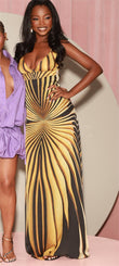 Make a bold statement in this Gold & Black Striped Plunge Neck Maxi Dress. The striking striped pattern, deep plunge neckline, and figure - hugging silhouette create a glamorous, head - turning look. Perfect for parties, events, or nights out.