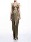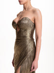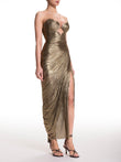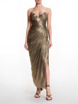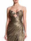 This gold off-the-shoulder maxi dress features a sweetheart neckline and delicate bust cutouts for added allure. The draped, pleated fabric creates a flattering silhouette, while the high slit adds drama while ensuring ease of movement.