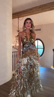 This stunning gown exudes captivating charm. The backless bodice is embellished with shimmering sequins in a variety of metallic hues, creating a stunning effect. The bodice is composed of flowing silver and gold tassels, flowing gracefully with every step. Paired with oversized gold earrings and multiple gold bracelets, this gown is perfect for special occasions like parties and celebrations, and its eye-catching, luxurious design is sure to make the wearer stand out.