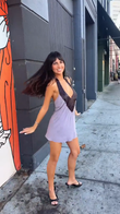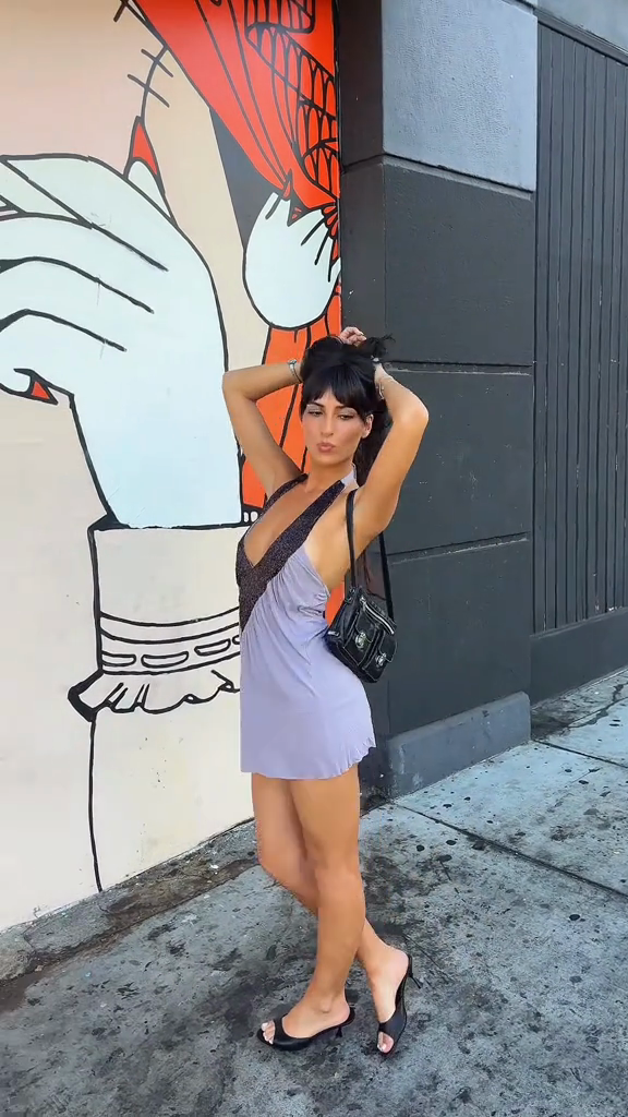 The person is wearing a lavender mini dress with a deep V - neckline. The dress features a contrasting dark, glittery panel at the chest. She accessorizes with a small black handbag, multiple bracelets on her wrists, and black open - toe high - heeled shoes. This outfit has a sexy and casual - chic vibe, suitable for a night out or a casual social event.