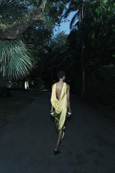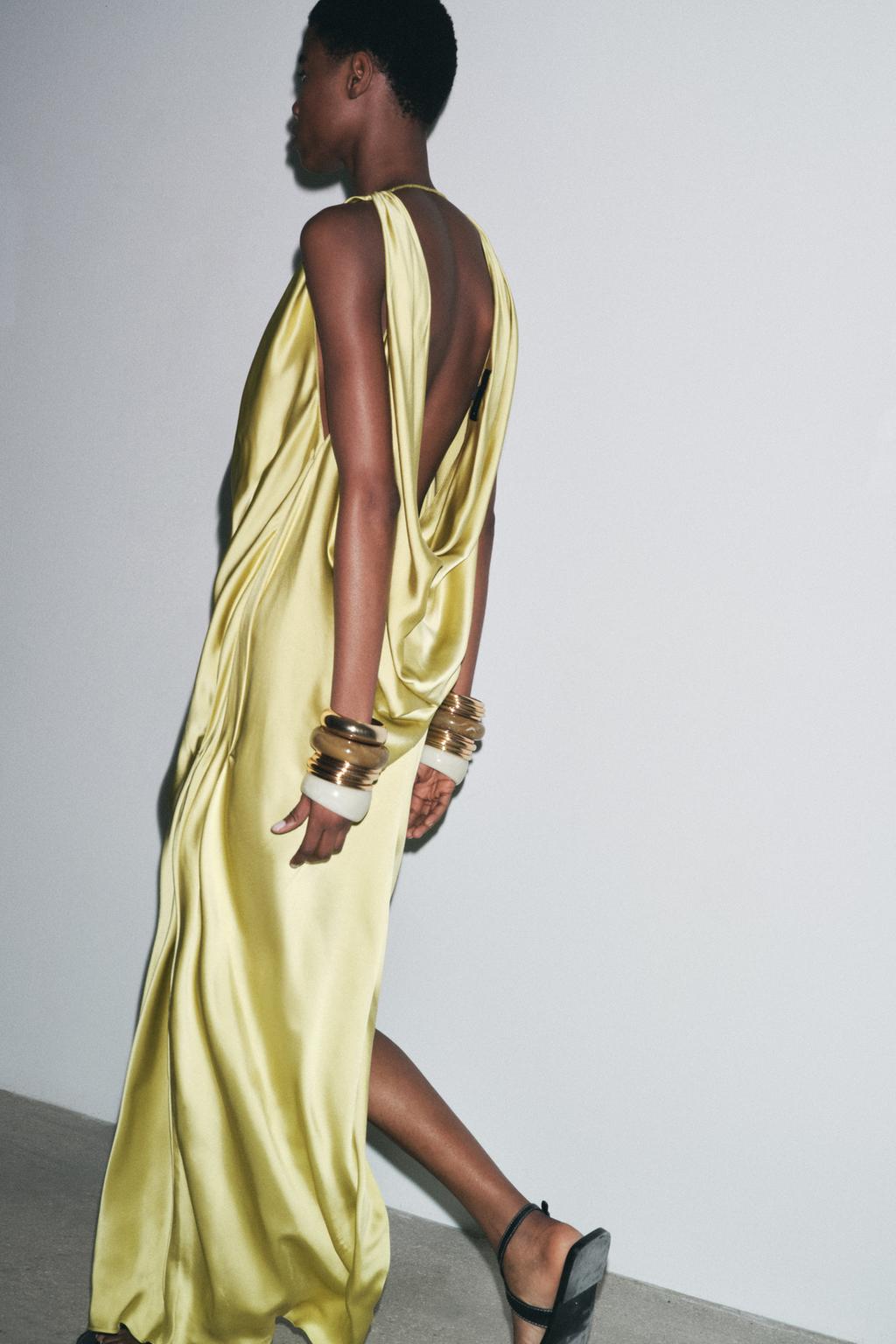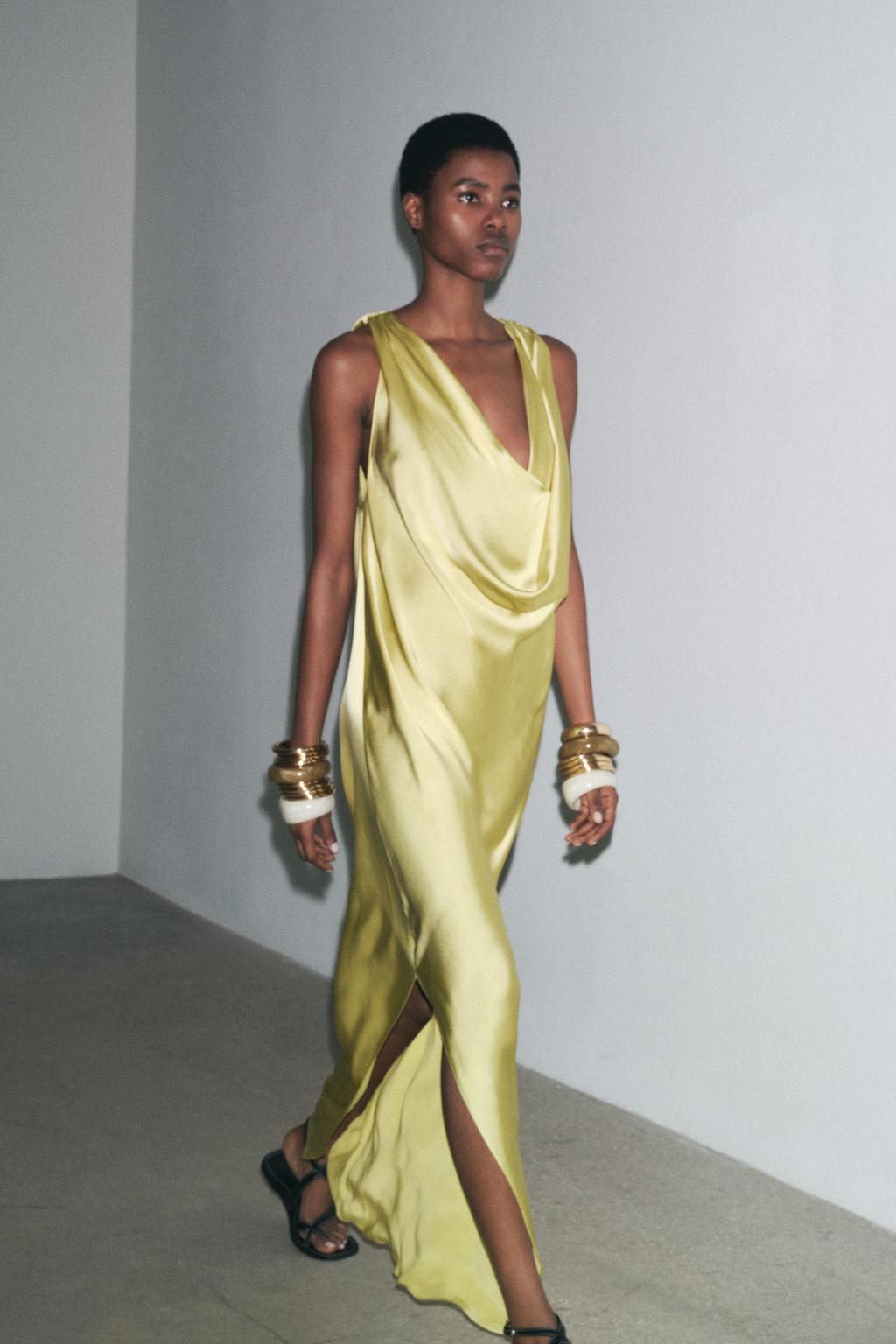 Elevate your elegance with this Lemon Yellow Satin Cowl Neck Maxi Dress. The draped cowl neckline and flowing silhouette create a graceful, sophisticated look. Paired with statement cuffs, it’s perfect for formal events or chic evenings. Shop now for a timeless, runway - inspired outfit!