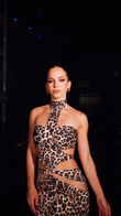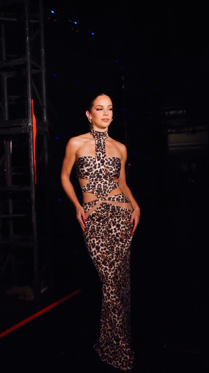 This leopard print dress features an off-the-shoulder design for a bold and captivating look. Clever cutouts at the waist and midriff add a touch of sexiness, while the fitted, maxi skirt elevates the overall elegance.