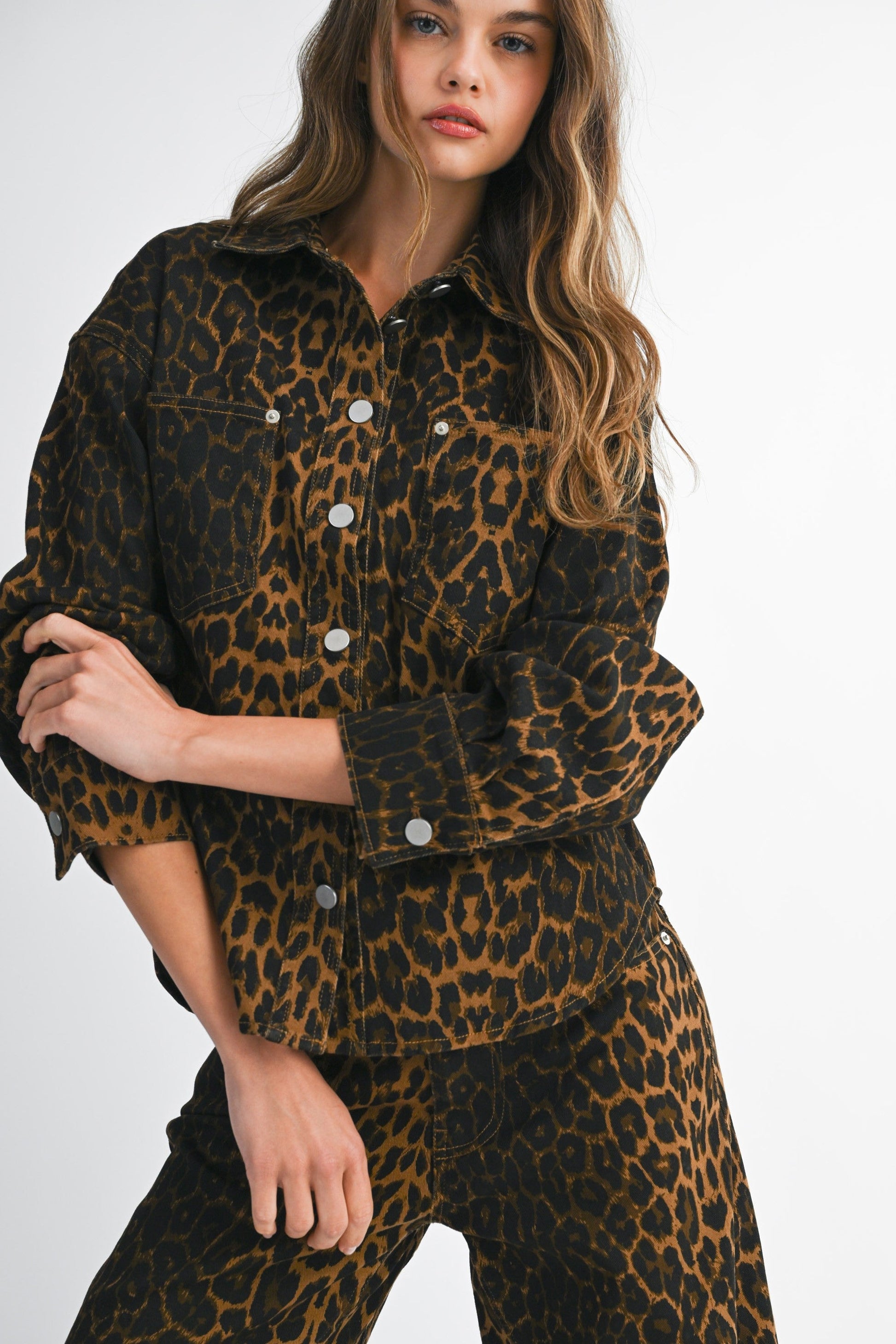 Make a bold fashion statement with this Leopard Print Denim Jacket and Wide - Leg Pants Set. The jacket features a classic button - up design, while the wide - leg pants offer a trendy, relaxed fit. Crafted from durable denim with an eye - catching leopard print, this set is perfect for adding a touch of edgy style to your wardrobe. Ideal for casual outings or nights on the town. Lightweight construction ensures fast page loading. Shop now and stand out!